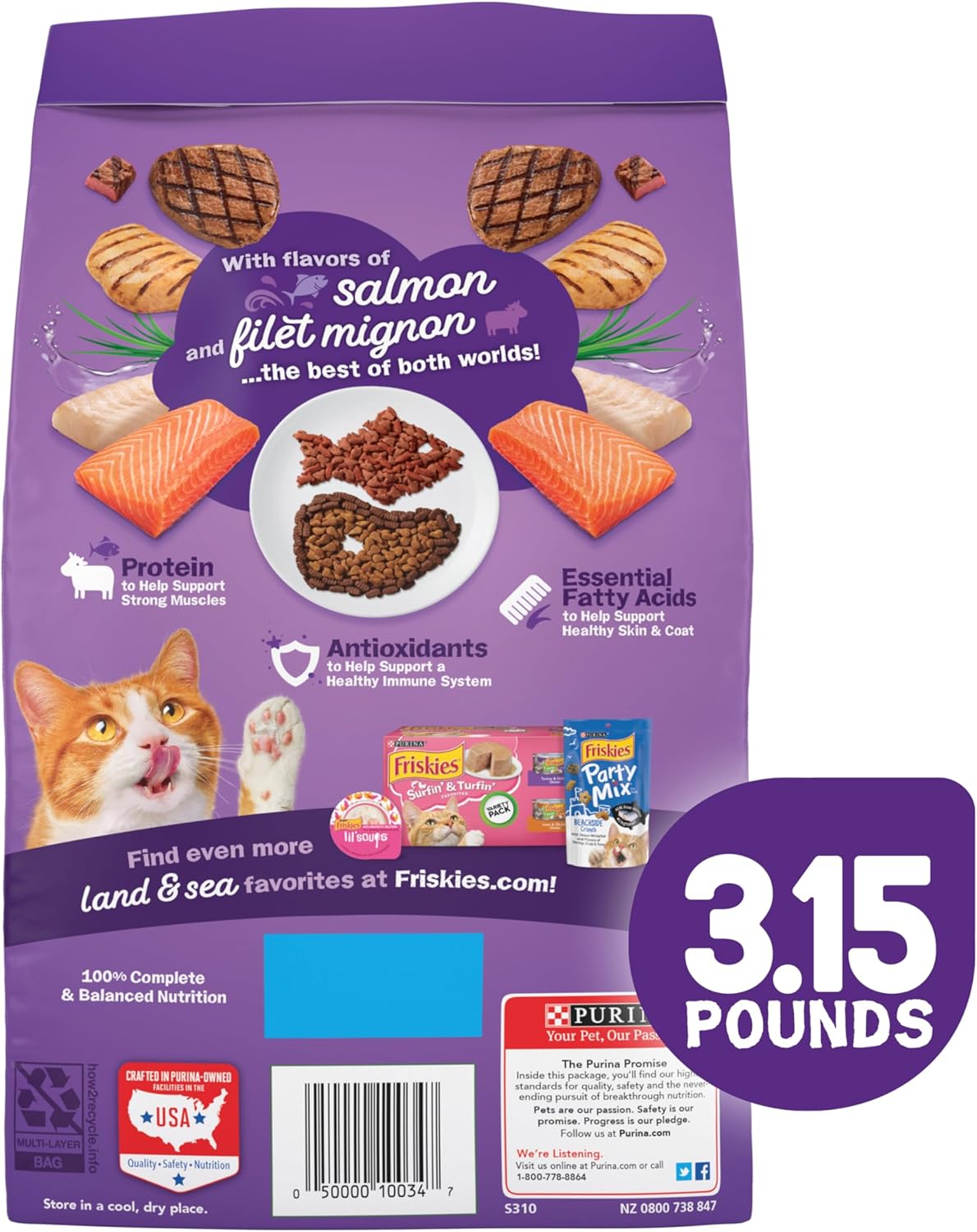 Ingredients<p>Give your cat a delectable flavor combination with Purina Friskies Surfin' & Turfin' Favorites dry cat food. Chicken, filet mignon, ocean whitefish, liver and salmon flavors deliver all her favorite tastes in one sensational serving, and the appealing shapes keep her excited about the foods you put in her dish. She'll love the enticing aroma, which lets her know something delicious awaits her, and you can feel good about the essential vitamins and minerals found in this tasty dry cat food. Featuring a formula that's complete and balanced for all life stages, this dry cat food can follow her from her cuddly kitten days to her playful adult years for yummy consistency in her daily diet. Offer up a hearty helping of this Purina Friskies dry cat food every day, and watch as your feline friend nibbles her way to the bottom of her dish. Every time you fill your Amazon.com cart with the flavors of Purina Friskies, you're just one step closer to filling her dish with the food she loves.<br /><br /></p> <p>Guaranteed Analysis</p> <p>Crude Protein (Min) 30.0%, Crude Fat (Min) 9.0%, Crude Fiber (Max) 5.0%, Moisture (Max) 12.0%, Linoleic Acid (Min) 1.5%, Arachidonic Acid (Min) 0.03%, Calcium (Ca) (Min) 1.0%, Phosphorus (P) (Min) 0.8%, Zinc (Zn) (Min) 125 mg/kg, Selenium (Se) (Min) 0.3 mg/kg, Vitamin A (Min) 10000 IU/kg, Vitamin E (Min) 100 IU/kg, Taurine (Min) 0.12%.</p>