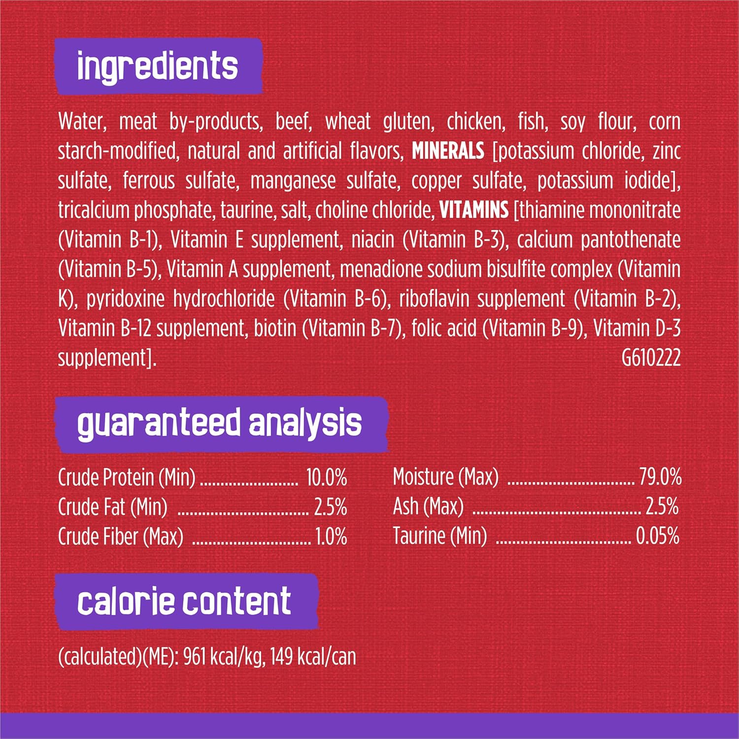 IngredientsWater, chicken, liver, wheat gluten, meat by-products, turkey, soy flour, corn starch-modified, artificial and natural flavors, tricalcium phosphate, MINERALS [potassium chloride, zinc sulfate, ferrous sulfate, manganese sulfate, copper sulfate, potassium iodide], taurine, added color, salt, choline chloride, VITAMINS [thiamine mononitrate (Vitamin B-1), Vitamin E supplement, niacin (Vitamin B-3), calcium pantothenate (Vitamin B-5), Vitamin A supplement, menadione sodium bisulfite complex (Vitamin K), pyridoxine hydrochloride (Vitamin B-6), riboflavin supplement (Vitamin B-2), Vitamin B-12 supplement, biotin (Vitamin B-7), folic acid (Vitamin B-9), Vitamin D-3 supplement]. F610018