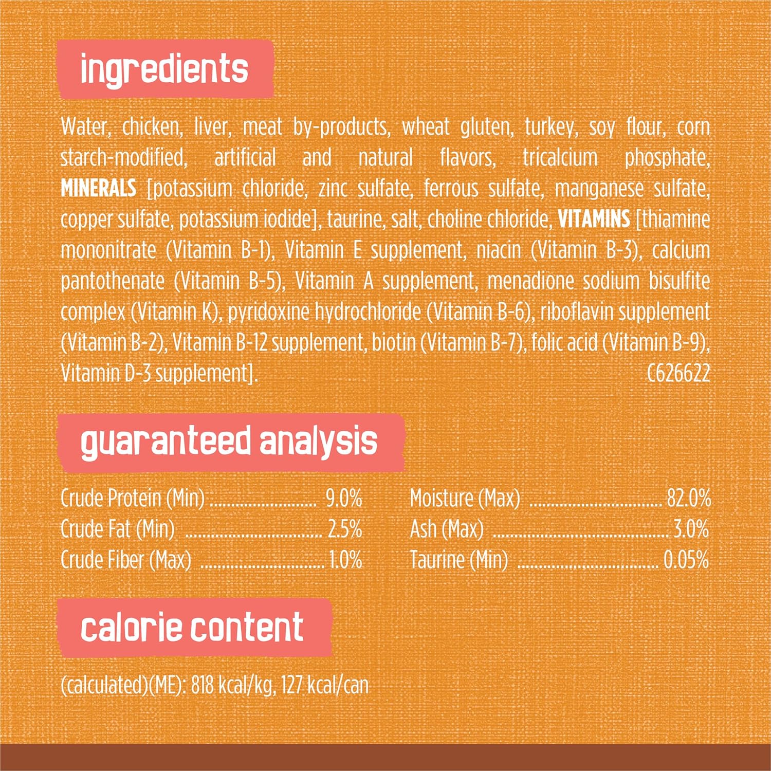 IngredientsWater, Chicken, Liver, Meat By-Products, Wheat Gluten, Turkey, Soy Flour, Corn Starch-Modified, Artificial And Natural Flavors, Tricalcium Phosphate, MINERALS [Potassium Chloride, Zinc Sulfate, Ferrous Sulfate, Manganese Sulfate, Copper Sulfate, Potassium Iodide], Taurine, Salt, Choline Chloride, VITAMINS [Thiamine Mononitrate (Vitamin B-1), Vitamin E Supplement, Niacin (Vitamin B-3), Calcium Pantothenate (Vitamin B-5), Vitamin A Supplement, Menadione Sodium Bisulfite Complex (Vitamin K), Pyridoxine Hydrochloride (Vitamin B-6), Riboflavin Supplement (Vitamin B-2), Vitamin B-12 Supplement, Biotin (Vitamin B-7), Folic Acid (Vitamin B-9), Vitamin D-3 Supplement]. C626625
