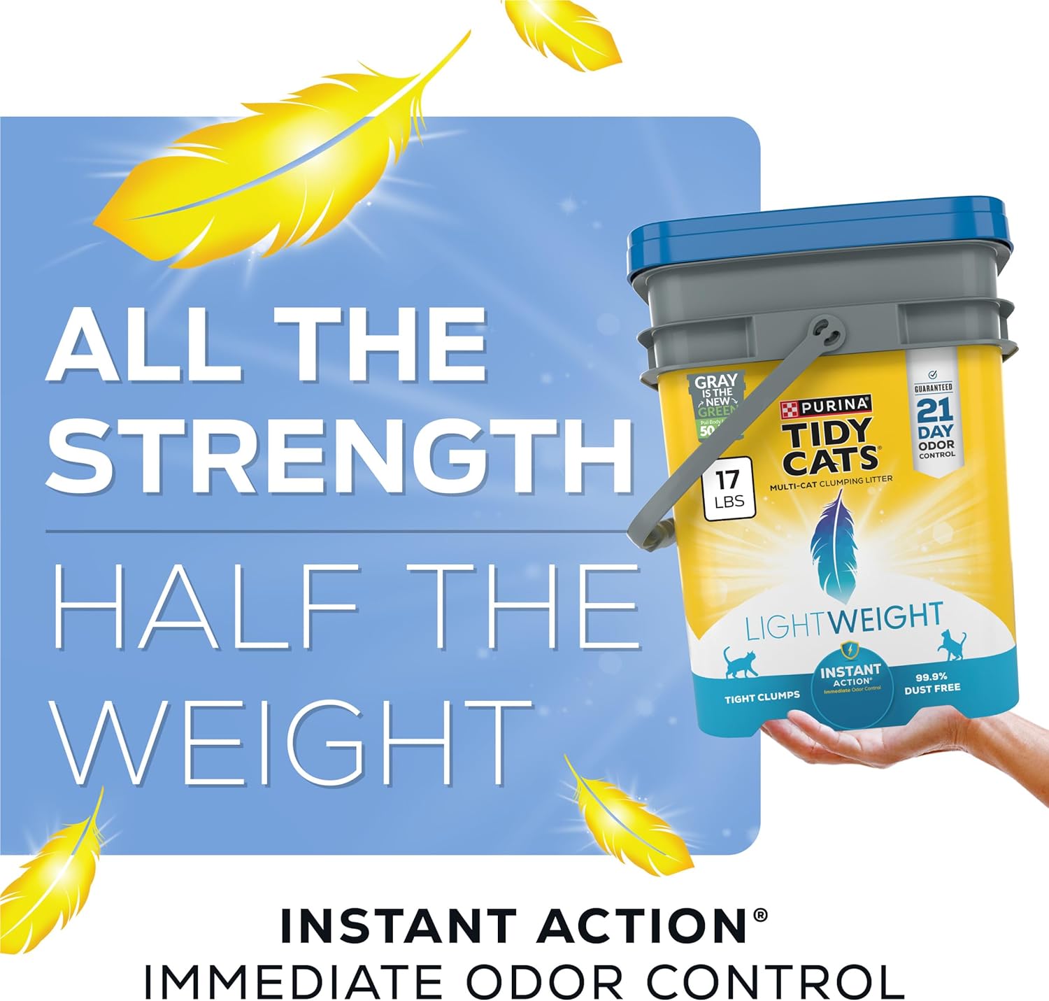 Purina Tidy Cats LightWeight Instant Action clumping cat litter offers powerful odor control in a lightweight formula designed for multiple-cat households. Weighing half as much as leading clumping litters, it is easy to carry, pour, and store without sacrificing performance. This low-dust litter creates tight, strong clumps for quick and simple cleanup, while the bright outdoors scent helps keep litter areas smelling clean and fresh.