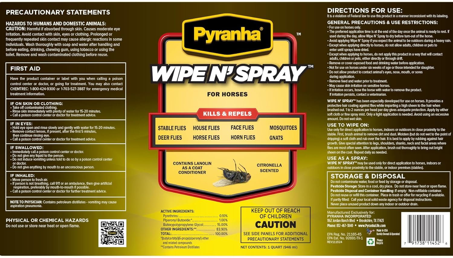 Triple Action Protection: Kills, repels, and conditions the coat; effective against horn, deer, horse, house, stable, and face flies, ticks, mites, mosquitoes, gnats, and lice.