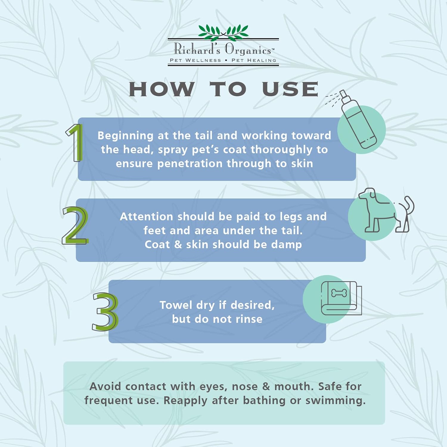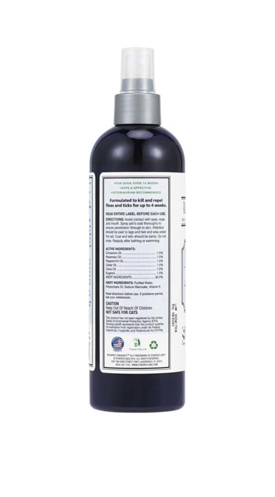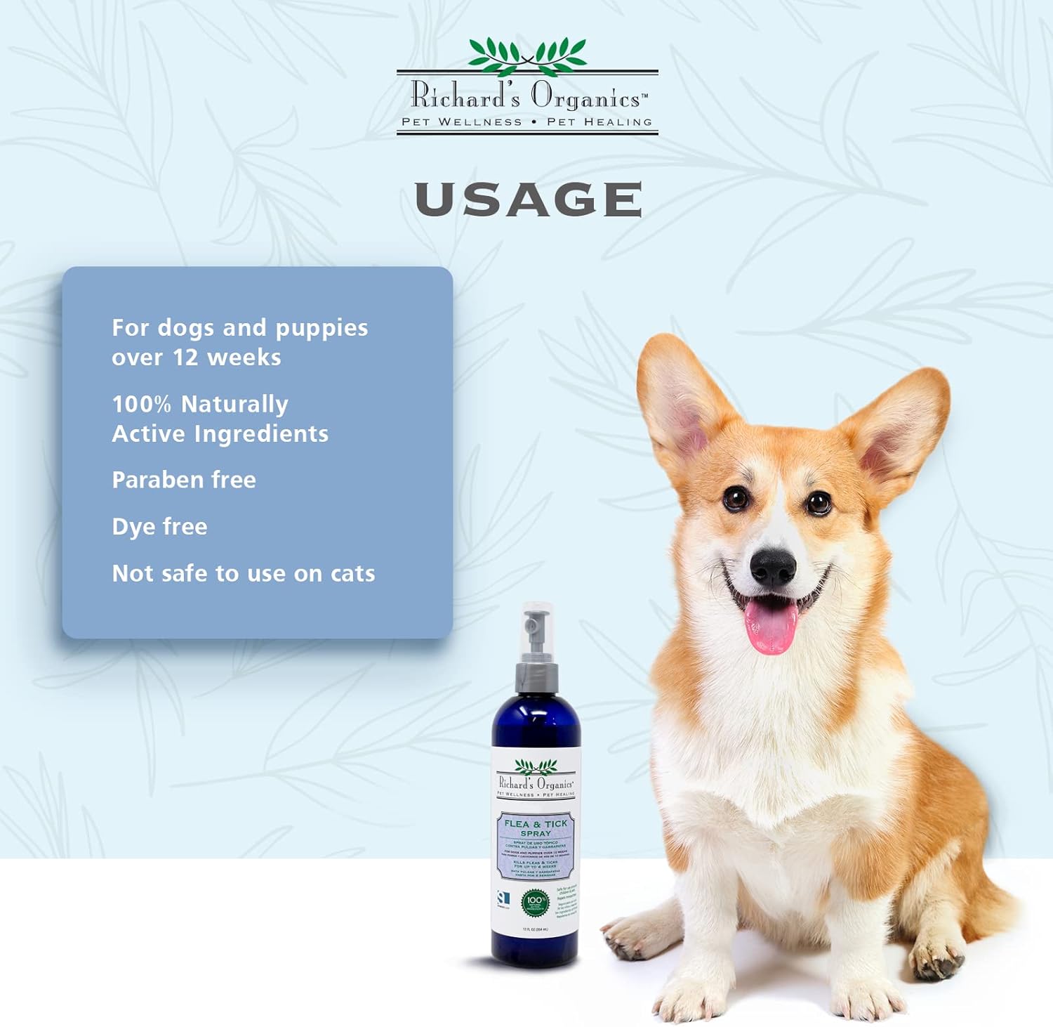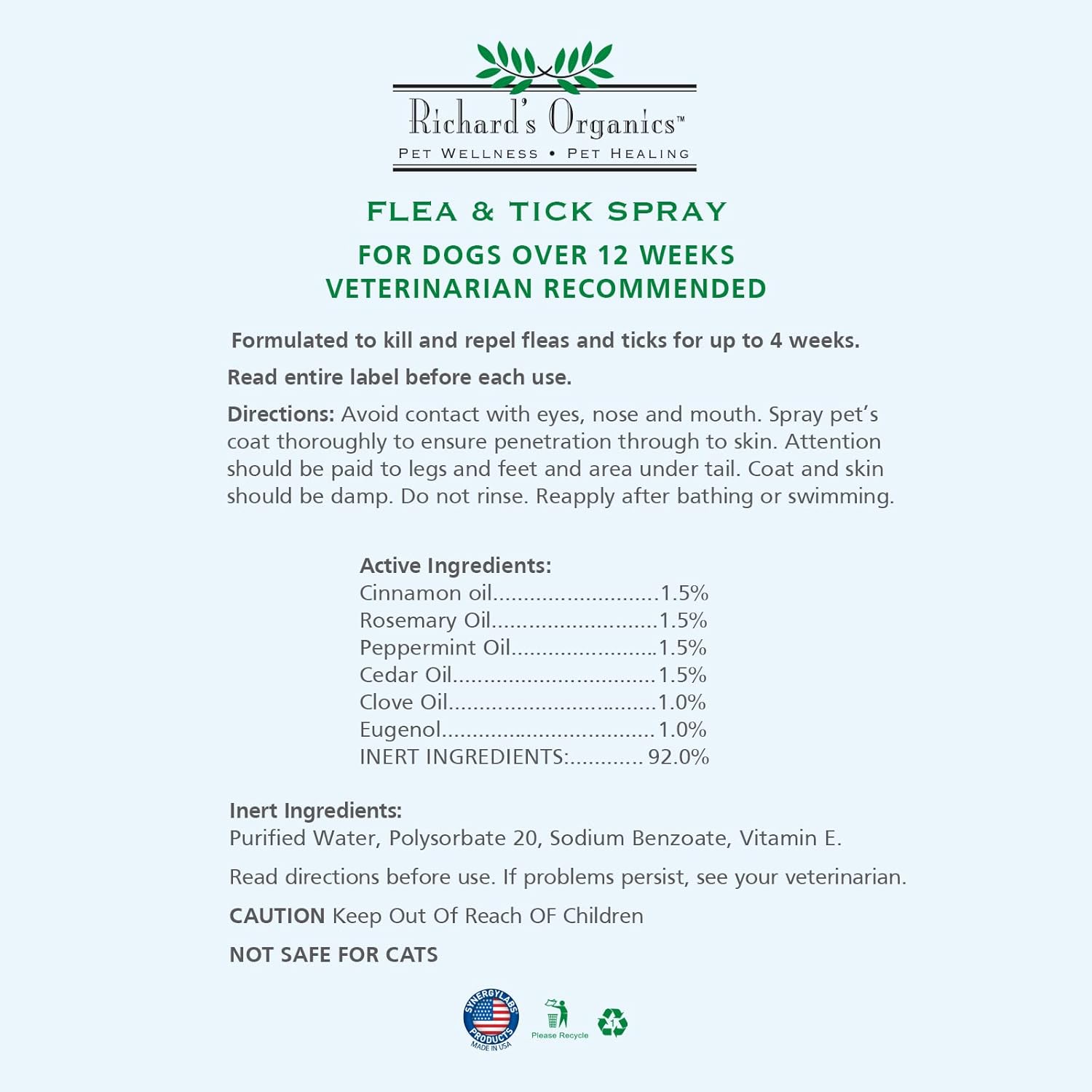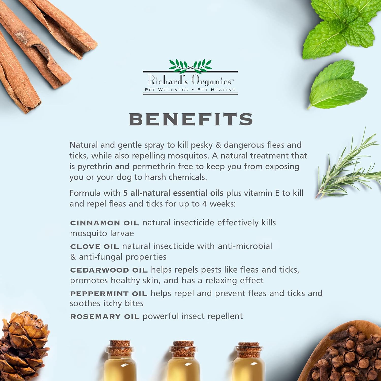 - NATURAL ACTIVE INGREDIENTS – Richard’s Organics gentle and safe Flea and Tick Spray uses all-natural active ingredients to kill fleas, ticks and repel mosquitos rather than harsh chemicals. Made with 5 pure essential oils, this dog spray smells great and soothes irritated skin while it rids your dog of fleas and ticks.
