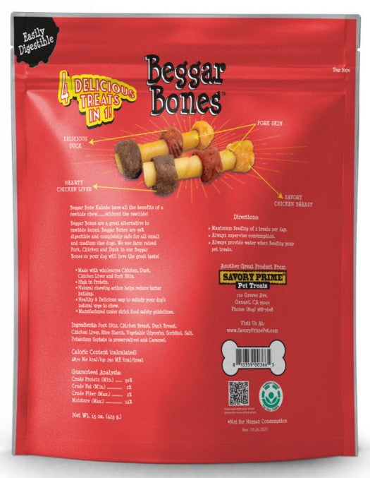 Savory Prime Beggar Bone 4-in-1 Kabobs are specially crafted for medium to large dogs, offering a unique combination of four flavorful ingredients in one treat. Each kabob is made with savory chicken breast, hearty chicken liver, delicious duck, and crispy pork skin, delivering a protein-rich and flavorful chew that supports healthy teeth and gums.