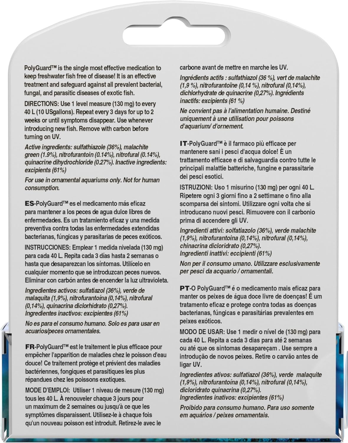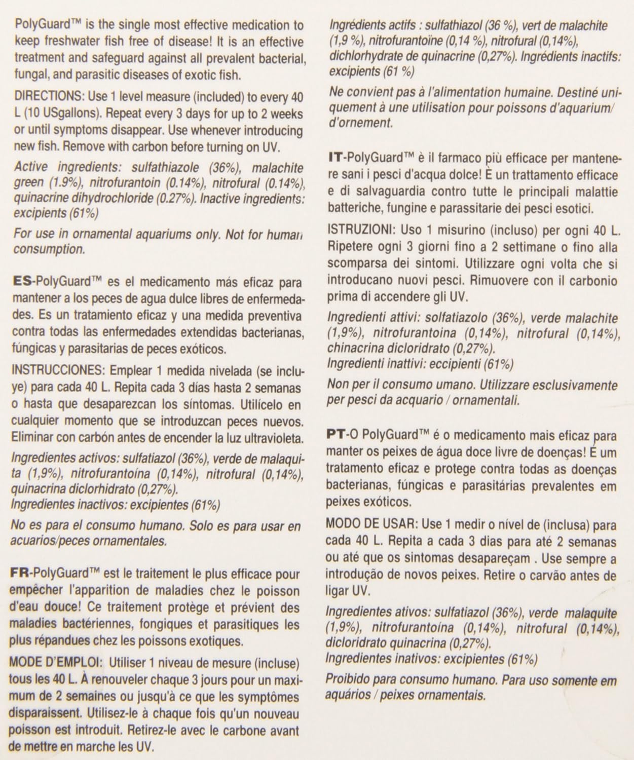 For ornamental fish Very broad spectrum freshwater medication Absorbed through the gills