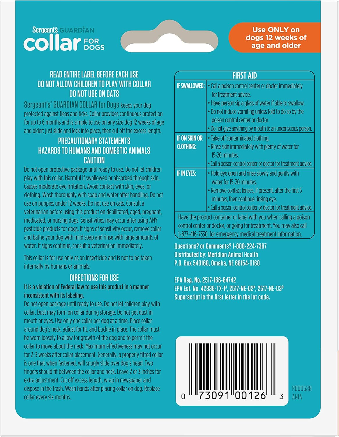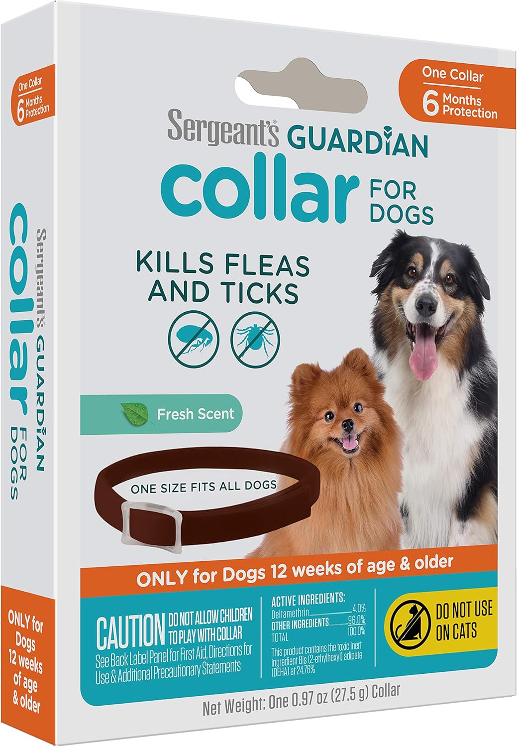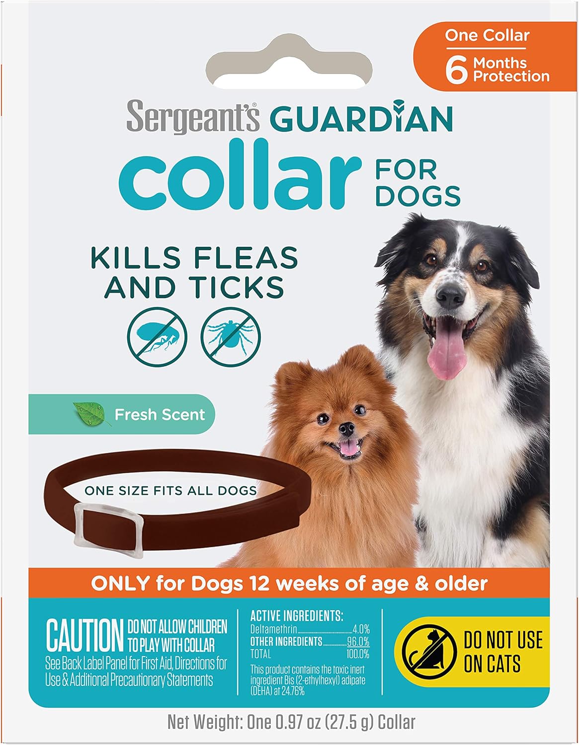 The Sergeant’s Guardian Flea & Tick Collar provides long-lasting protection against fleas and ticks for up to 6 months. Specially formulated for dogs over 12 weeks old, this quick-drying, fresh-scent collar is an easy and effective alternative to messy topical treatments. Simply slip it on your dog for continuous control and peace of mind.