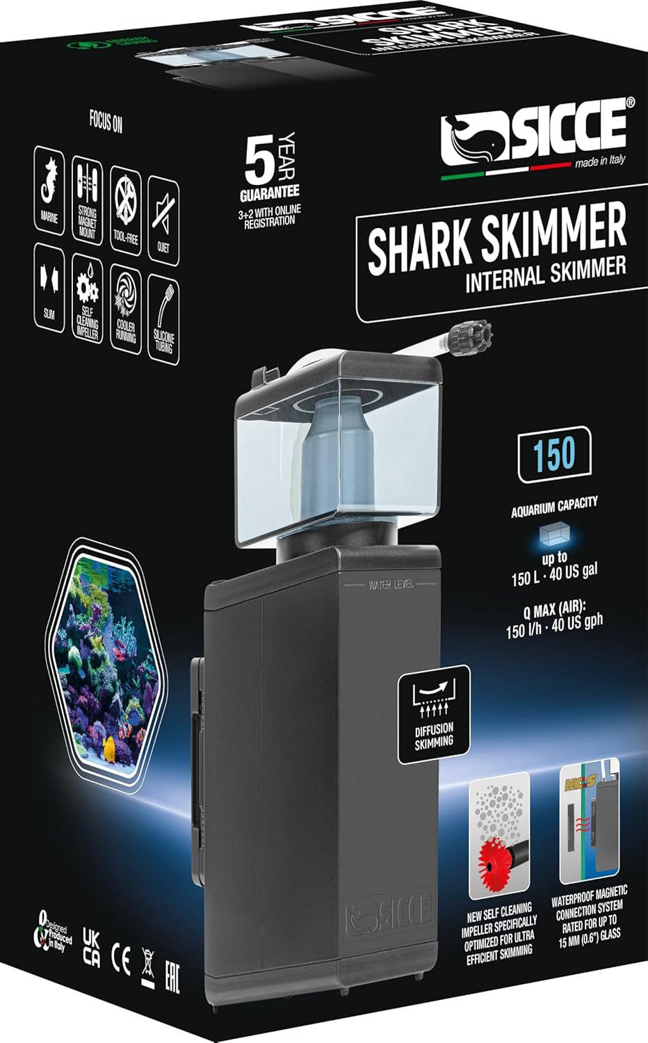 Sicce Shark Nano Protein Skimmer 150 up to 40 Gallon Saltwater Aquariums | Ultra Quiet Pump, Adjustable, Compact, Small Aquarium Marine Reef Tank