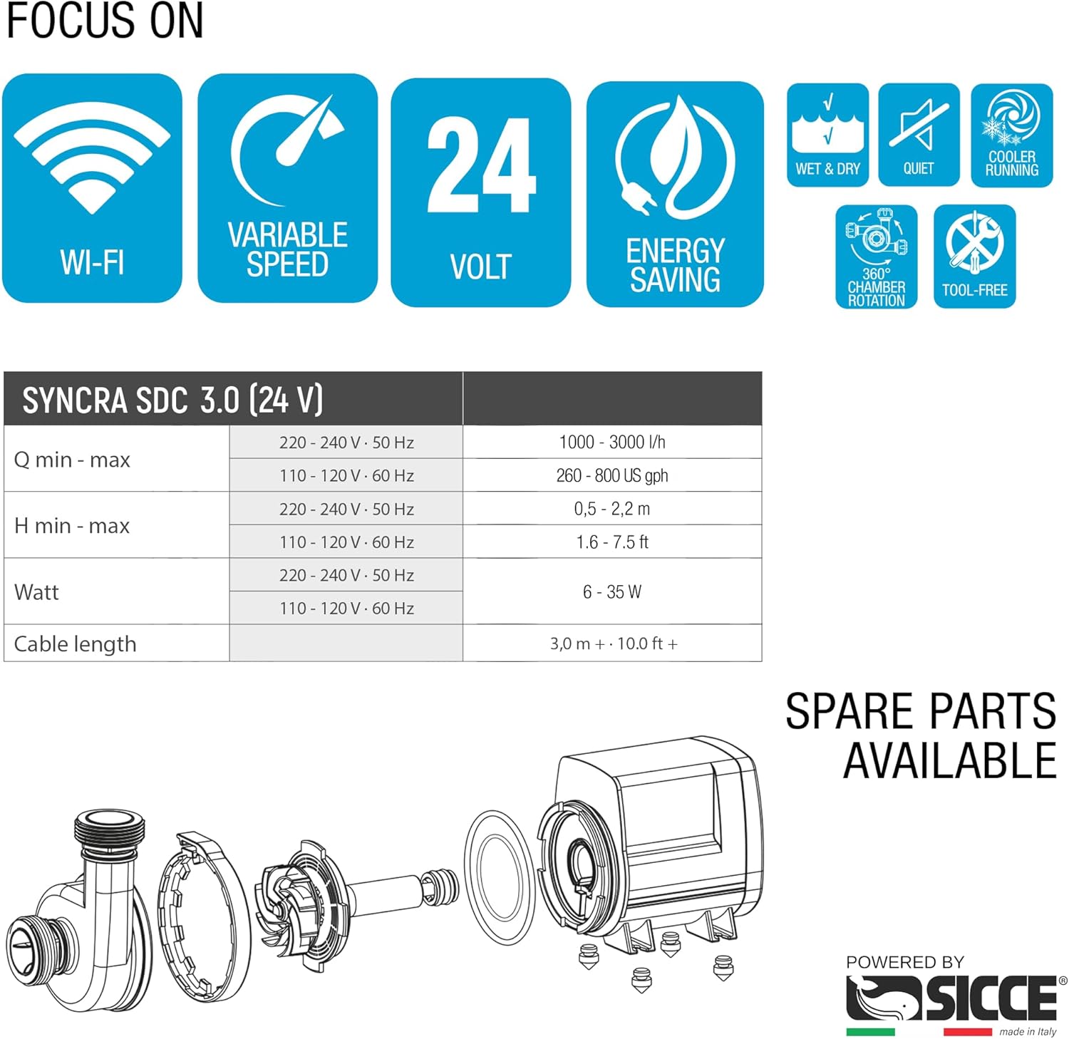 SICCE Syncra SDC 3.0 Water Pump 260-800 gph WIFI Apex Controllable Aquarium DC Return with Controller | Quiet Freshwater Saltwater Fish Tank Sump Pond