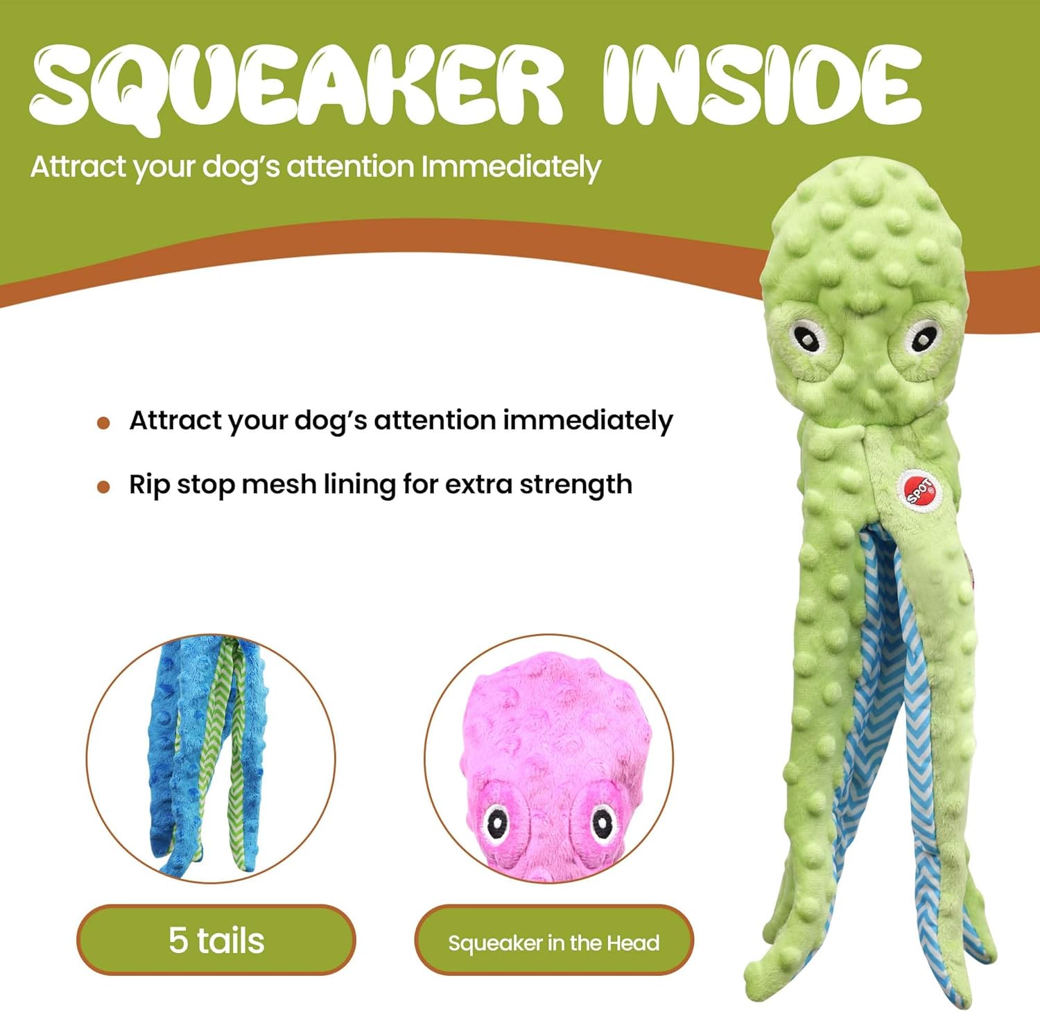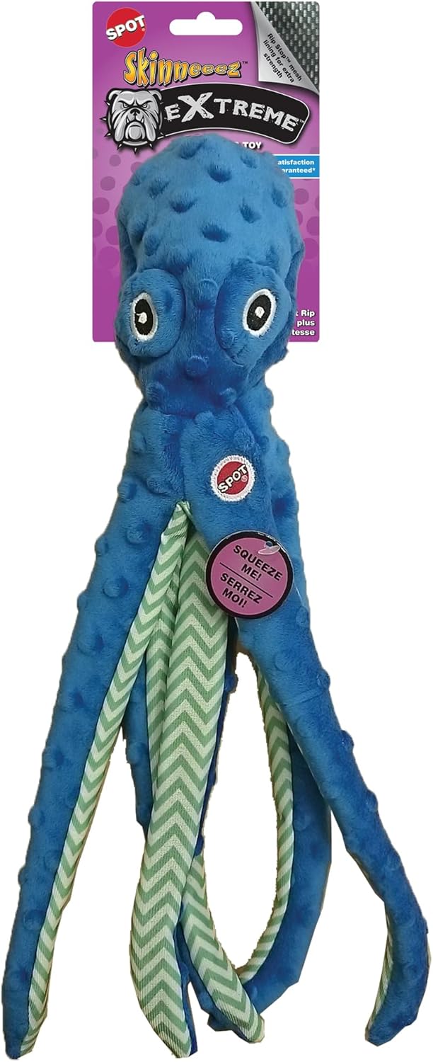 Skinneeez Extreme Stuffless Dog Toy with Squeaker | Extra Strong Plush Tug of War Octopus Squeak Toy for Small and Large Dog Breeds