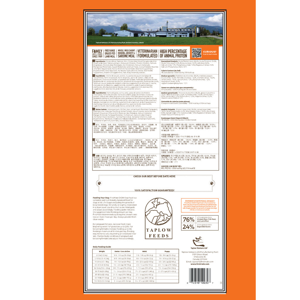 Skoki, a FirstMate manufactured formula, is a high quality, high value, corn and wheat free dog food diet. Using quality ingredients, regionally sourced from within the Pacific Northwest, Skoki includes a combination of Chicken, Fish, and Lamb as the primary sources of protein. Rich in omega 3 and 6 fatty acids this formula is ideal for everyday feeding. Skoki is available in a 40lb bag and is the right choice for the economically minded customer that does not want to compromise quality ingredients and manufacturing.