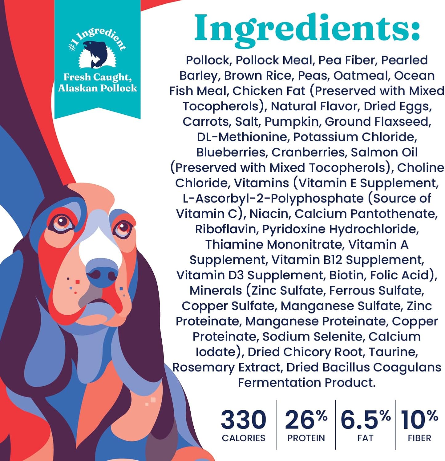 Ingredients Pollock, Pollock Meal, Pea Fiber, Oatmeal, Brown Rice, Peas, Pearled Barley, Turkey Meal, Chicken Fat (Preserved...