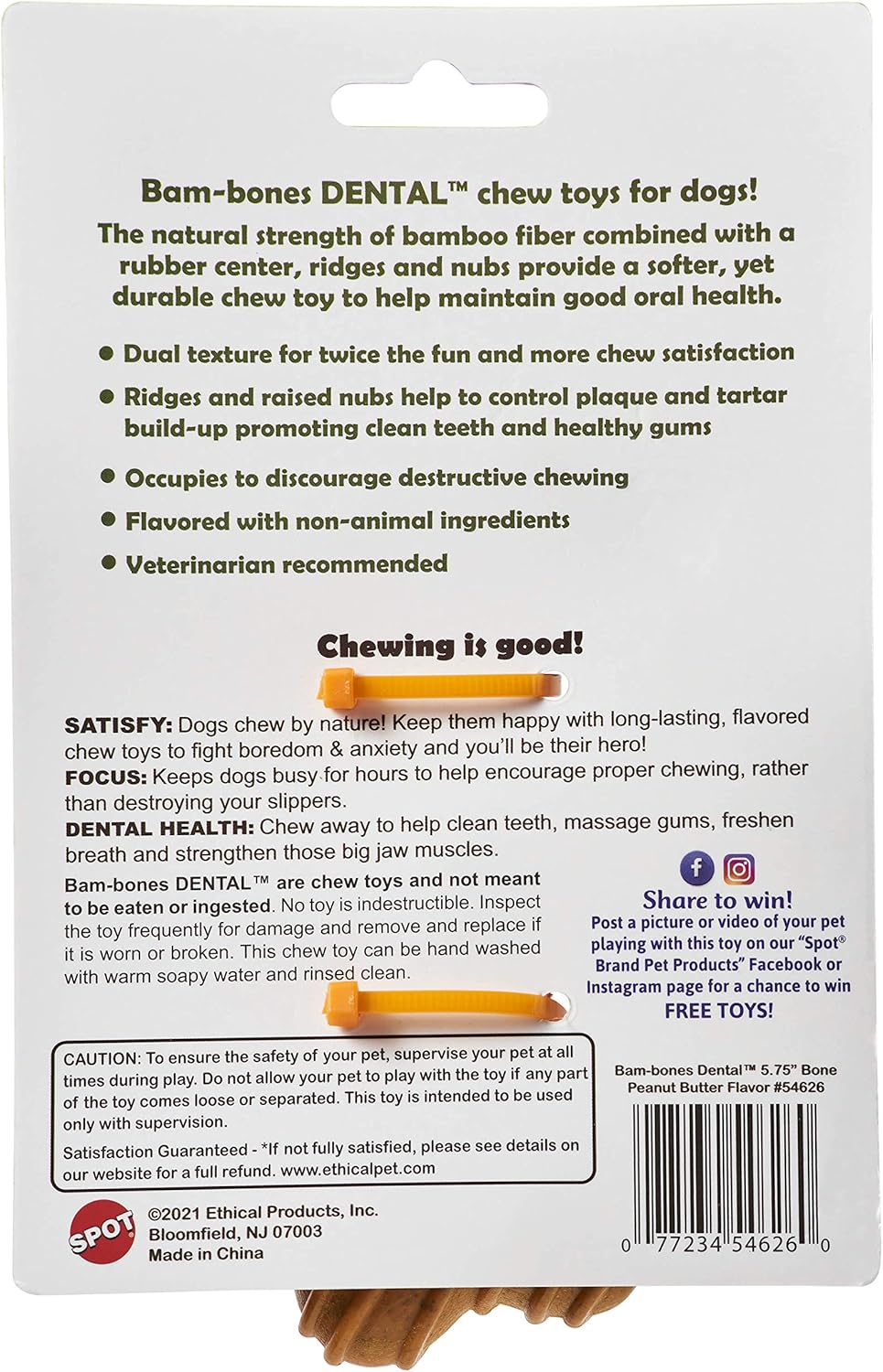 SPOT Bam-Bones Dental Bone - Made with Bamboo Fiber and a Massaging Rubber Center, Durable Oral Care Dog Chew for Light Chewers & Teething Puppies Under 25lbs, Allergen Free Peanut Butter Flavor