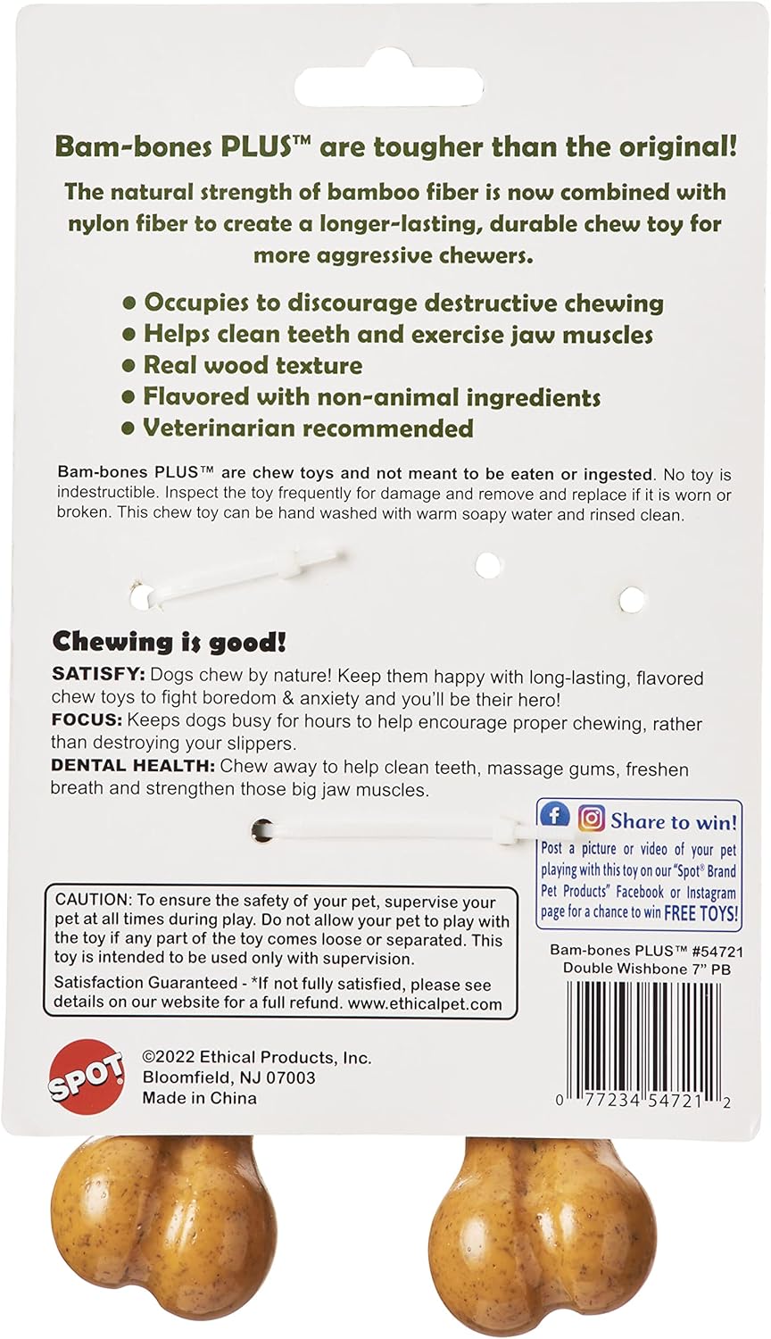 SPOT Bam-bones PLUS Double Wishbone -Bamboo Fiber & Nylon, Durable Long Lasting Dog Chew for Aggressive Chewers for Dogs & Puppies under 90lbs, Non-Splintering, 7in, Allergen Free Peanut Butter Flavor