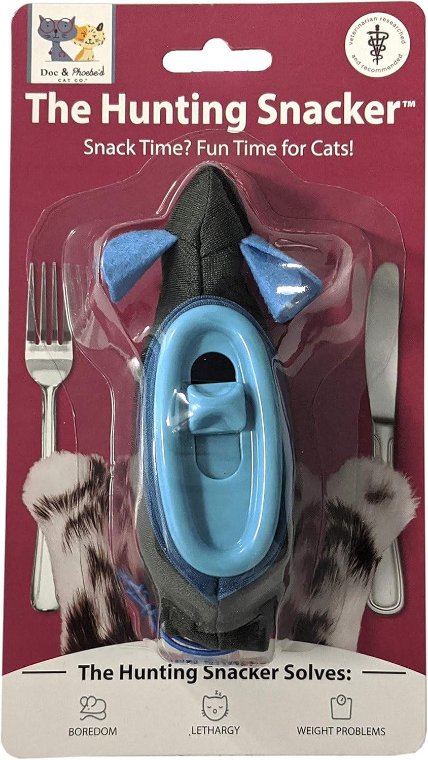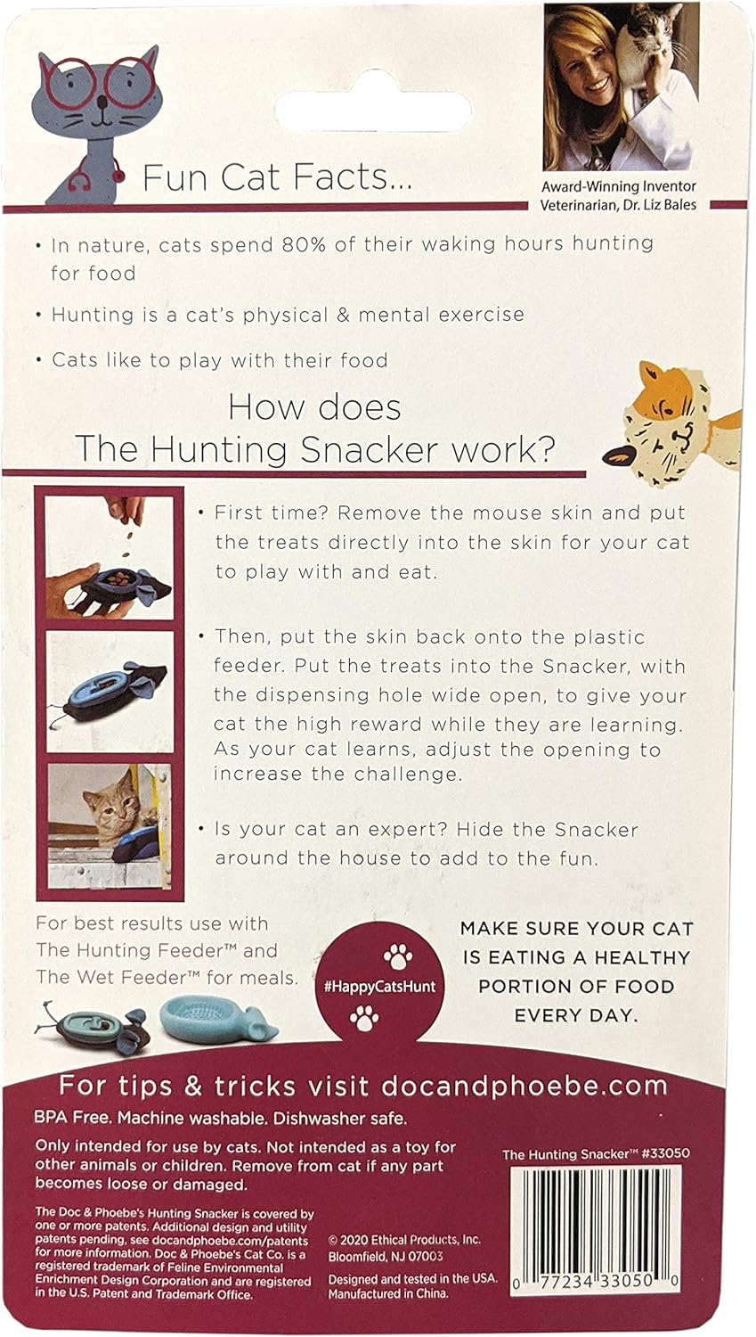 Doc & Phoebe's The Hunting Snacker makes snack time fun time! Cats are designed to hunt, catch and play with their food, and now they can with this treat despensing mouse, Simply fill, and hide and treat your cat with the hunt. The adjustable slide allows you to customize the difficulty of delivering of treats from beginner to expert. Hunting is a cat's physical and mental exercise and helps to prevent boredom & help your pet maintain a healthy weight. Mimic the natural instinct for hunting for food and turn mealtime into a fun game. This toy also provides portion control for cats who are prone to overeating. Veterinarian researched and recommended