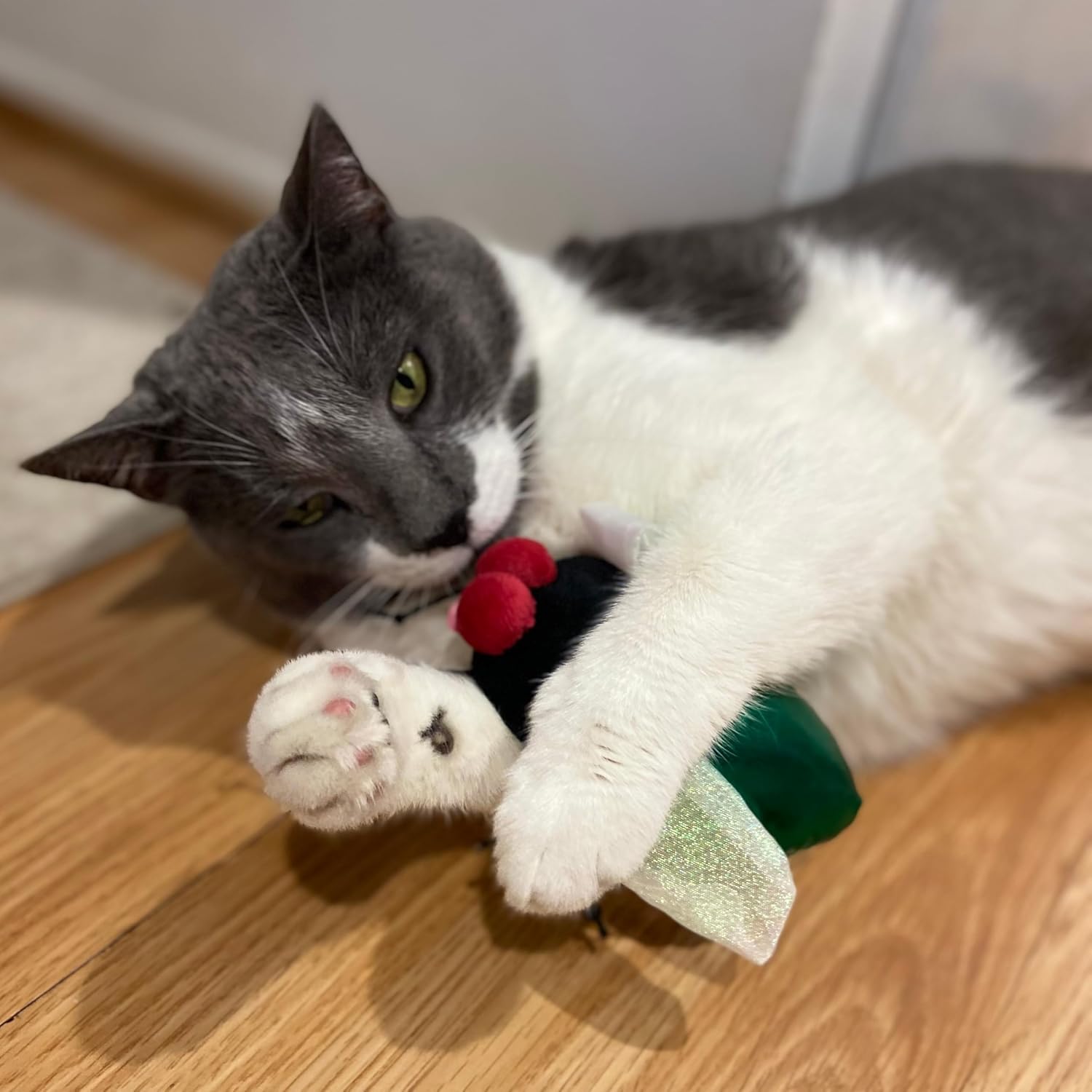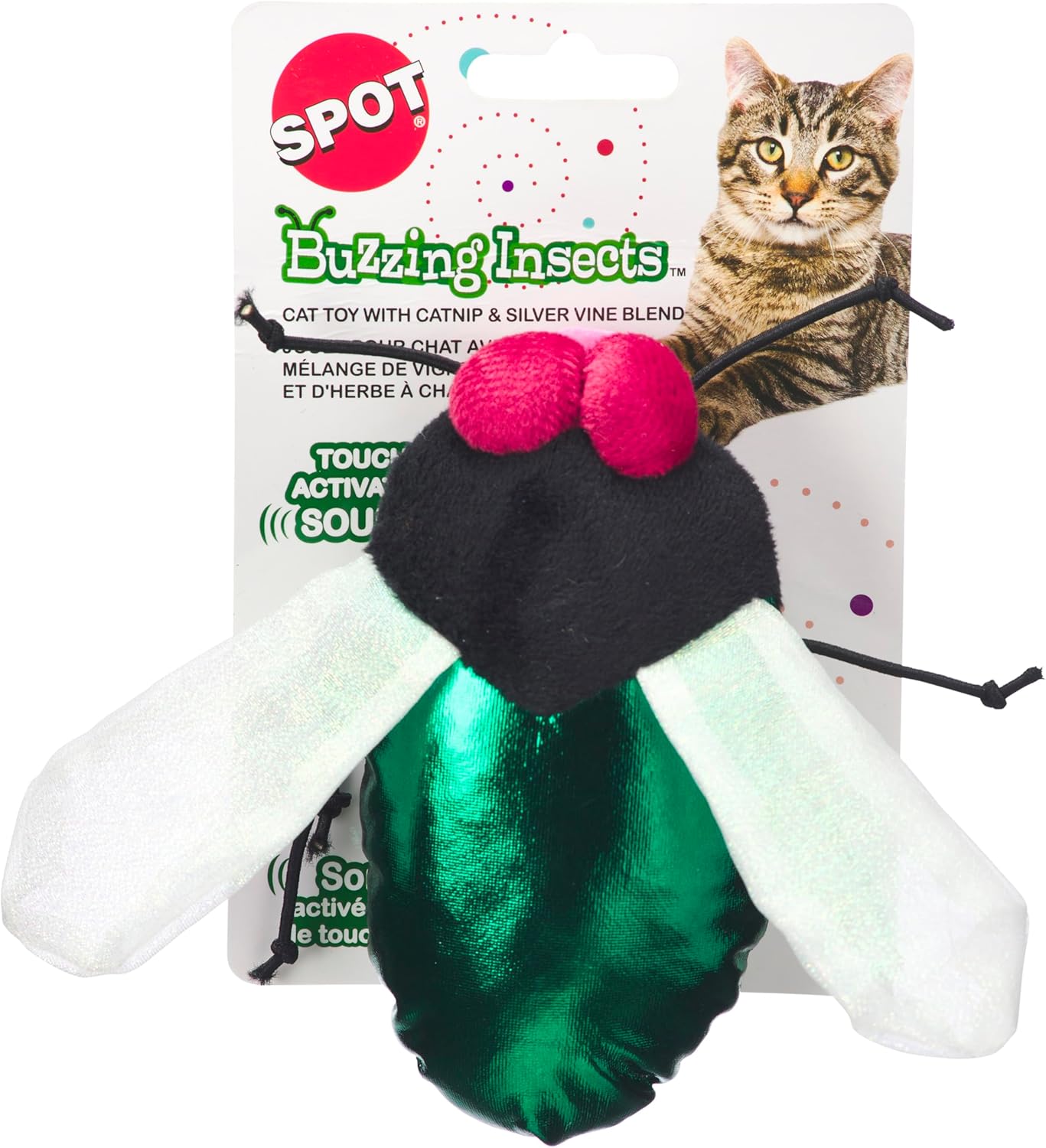 Jumbo sized insects Realistic buzzing sounds Sound activates as kitty bats and swats Includes catnip/silver vine blend...