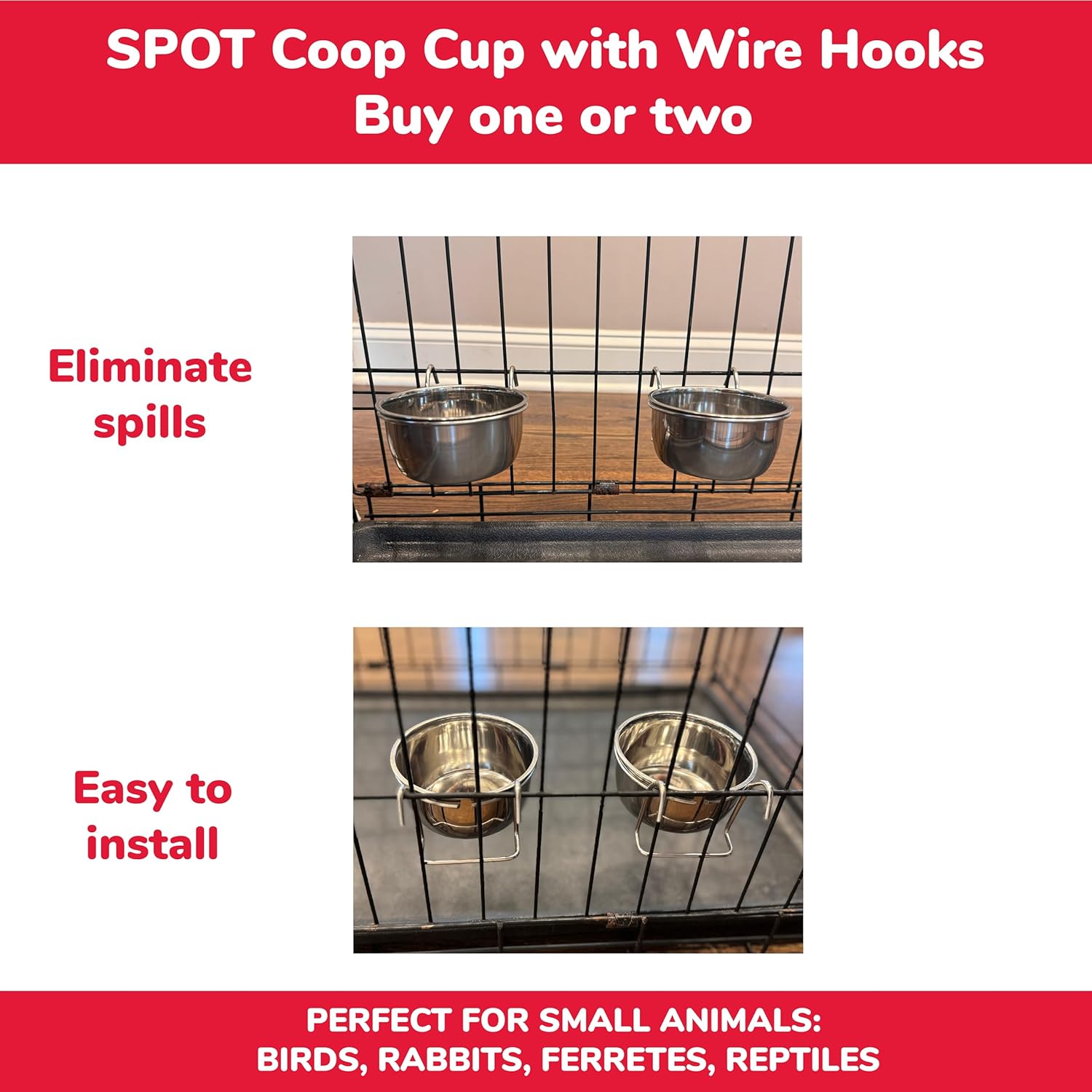SPOT Stainless Steel Coop Cup with Wire Hooks – Durable, Chew-Resistant Food Bowl for Cages and Crates, Ideal for Feeding Birds, Parrots, Rabbits, Ferrets, and Reptiles