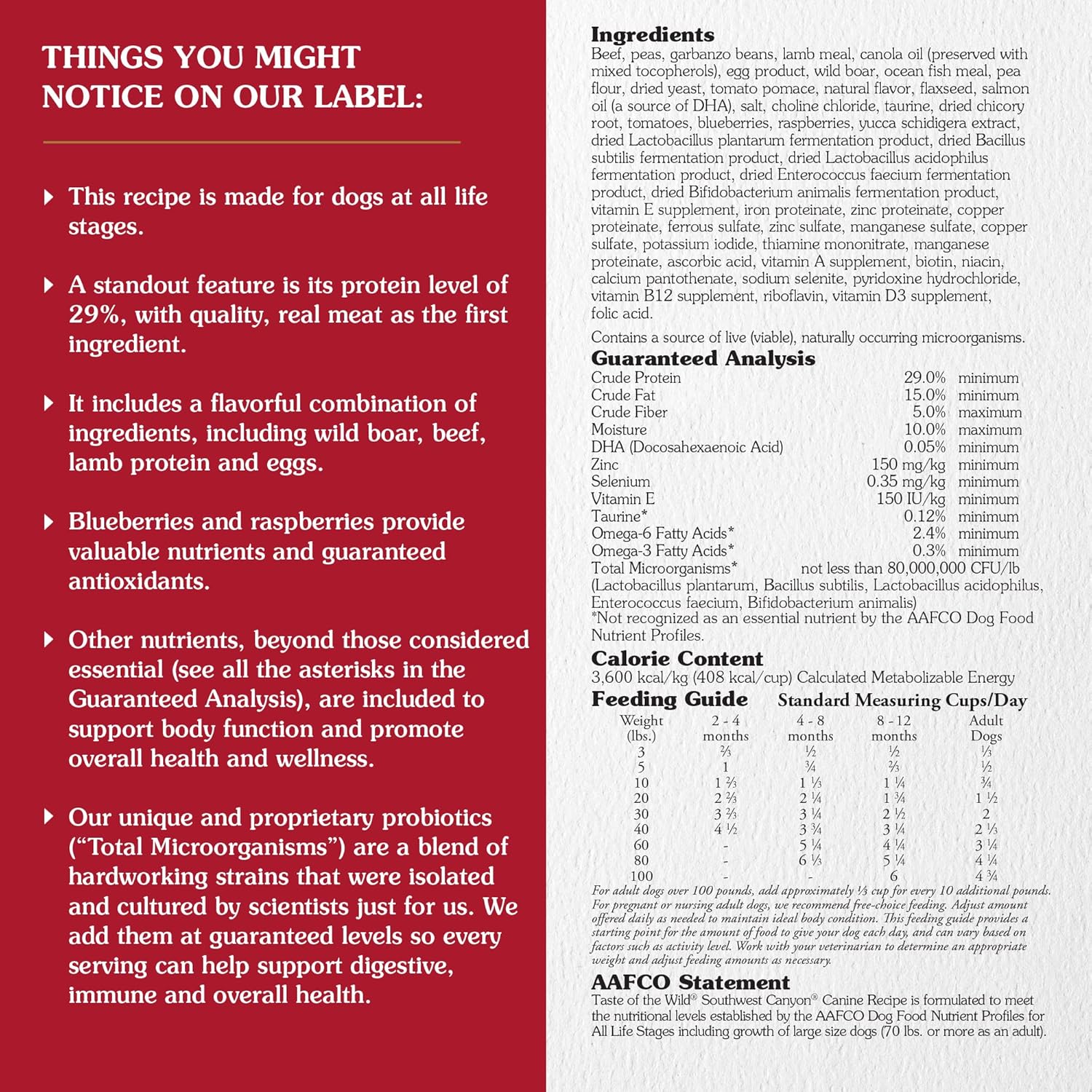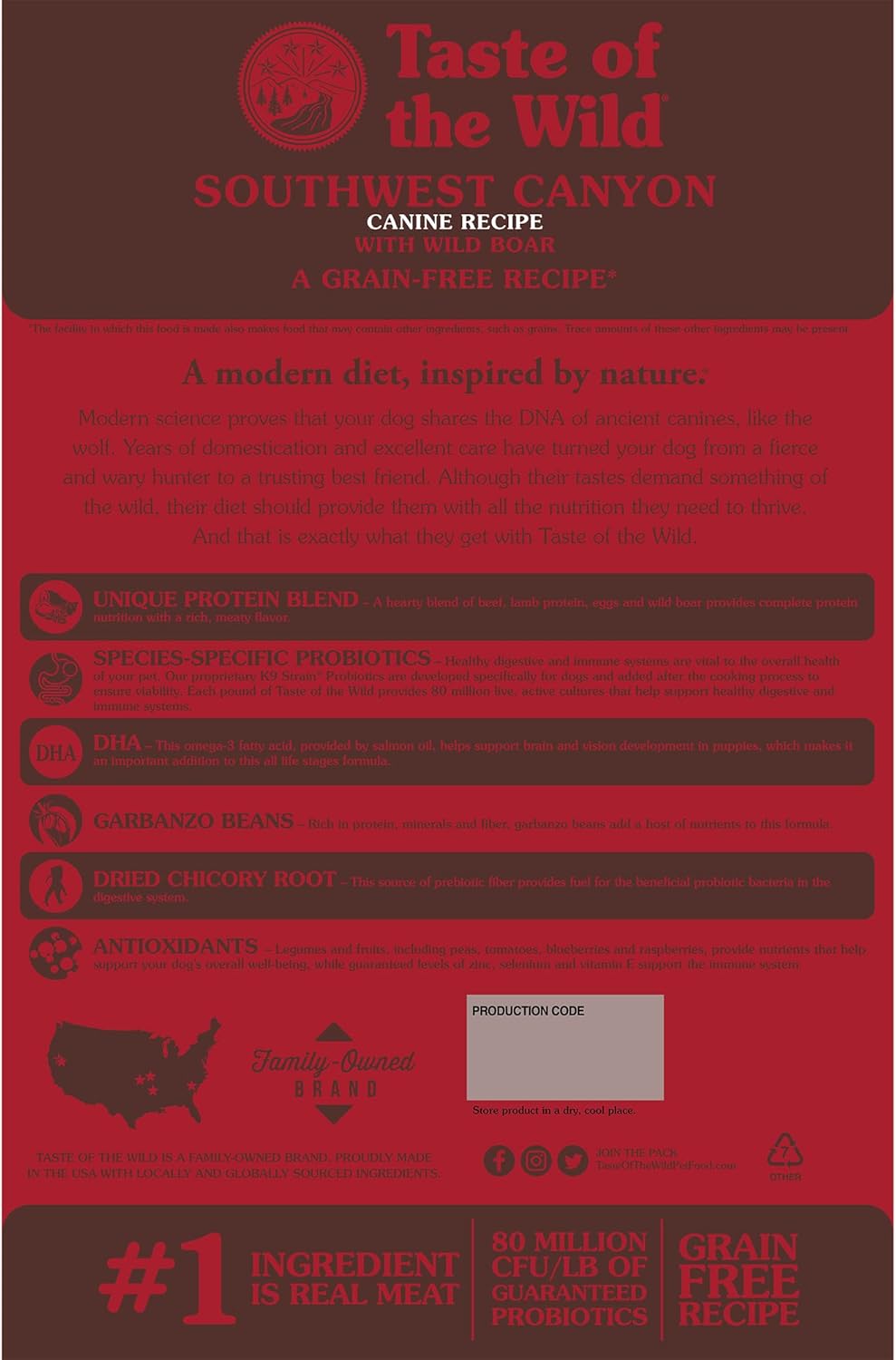 Taste of the Wild Southwest Canyon is just what your meat loving mutt craves! Complete with beef, lamb, and boar, and including nutritious grain-free carbs like sweet potatoes, peas, carrots, and blueberries, healthy nutrition and great taste meet at last. With beef as the first ingredient, this diet is designed to mimic an ancestral diet free of grains, yet packed with real meat as nature intended. Your dog will find all the nutrition their bodies need in Taste of the Wild Southwest Canyon Dry Dog Food, all while staying away from the nasty fillers like corn, soy or meat by-products.