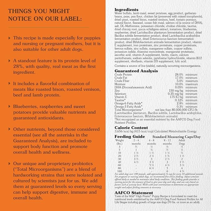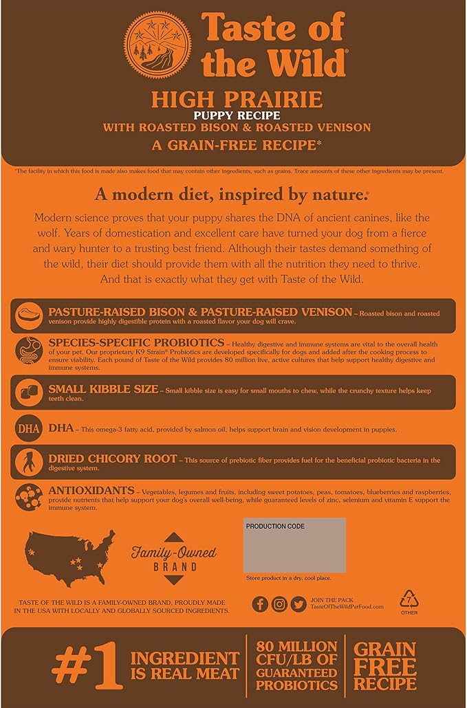 Taste of the Wild High Prairie Puppy with roasted bison and venison is a premium, grain-free recipe with sweet potatoes and peas providing your growing puppy all the proper nutrition needed for optimal development. Bison and venison are excellent alternative proteins to poultry, and provide exceptional protein and fat levels for your canine carnivore. With roasted buffalo as the first ingredient, this diet mimics an ancestral diet free of grains and packed with real meat. Supplemented with fruits and vegetables, Taste of the Wild High Prairie Puppy delivers antioxidants, healthy Omega fatty acids, and vitamins and minerals for healthy growth. Special small kibble size makes it easy for small mouths to enjoy.