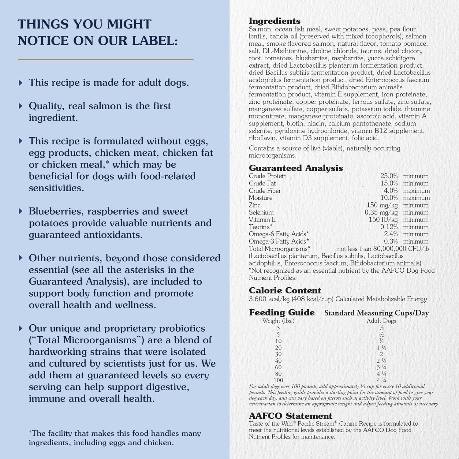 Your pet still shares the DNA of the ancient canine. While dogs have evolved over time, the taste for fresh meats and high quality natural carbohydrates remains. Taste of the Wild is dedicated to providing premium, grain free recipes based on your pet's ancestral diet. All of Taste of the Wild's recipes rely on ingredients like quality meats and probiotics that maximize the nutritional health benefits for your pets. Each recipe is made with real roasted meats and supplemented with vegetables, legumes and fruits. These grain free recipes provide a superior taste sensation, highly digestible energy and antioxidants to support a healthy immune system. Taste of the Wild is manufactured in the USA to ensure safety and quality. Your pets crave a taste of the wild. Go ahead and give them one. It's the balanced diet that nature intended.