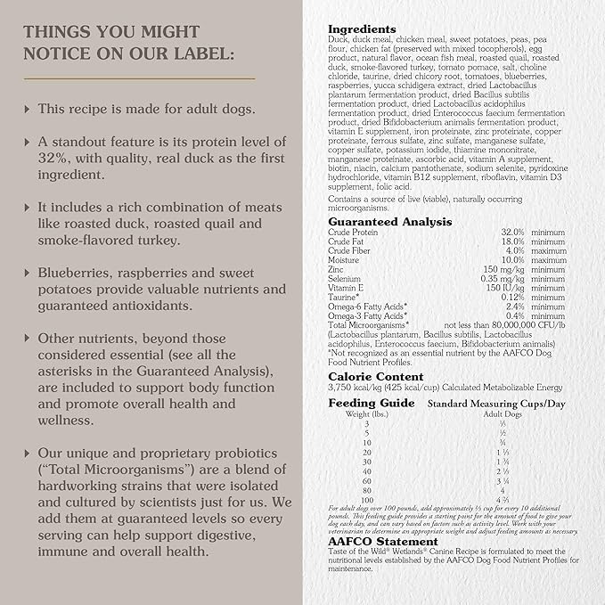 Taste of the Wild Wetlands is the ultimate high quality protein recipe for your canine carnivore. Complete with chicken, duck, smoked turkey, and quail, along with nutritious grain-free carbs like sweet potatoes, peas, carrots, and blueberries, it's everything your pet needs for an optimal diet. Multiple protein sources lower the risk of developing food sensitivities, while this grain-free recipe packed with probiotics and Omega 3 fatty acids is easily digestible for dogs. With chicken as the first ingredient, it is designed to mimic an ancestral diet free of grains, yet packed with real meat as nature intended. Your dog will find all the nutrition their bodies need in Taste of the Wild Wetlands Dry Dog Food, all while staying away from the nasty excesses like corn, soy or meat by-products.
