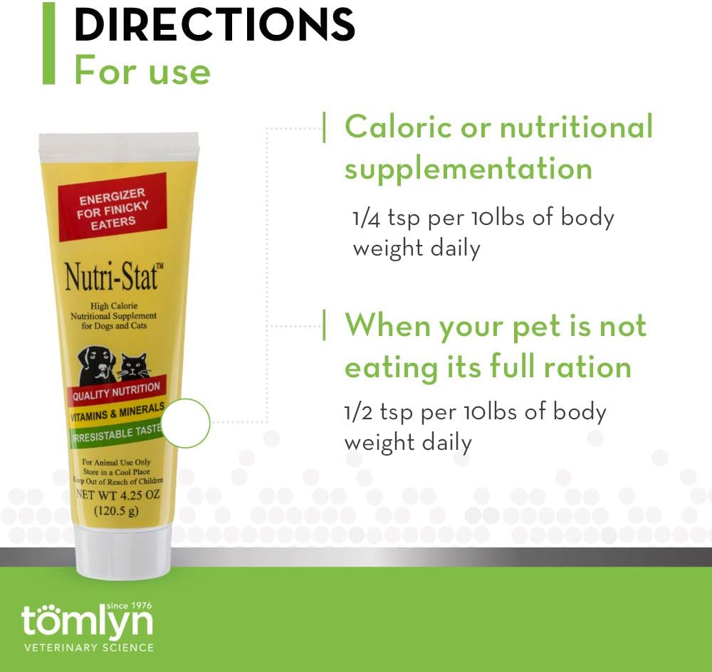 Administer as labeled on the package or follow your veterinarian’s instructions. Nutri-Stat is intended for intermittent or supplemental feeding only.