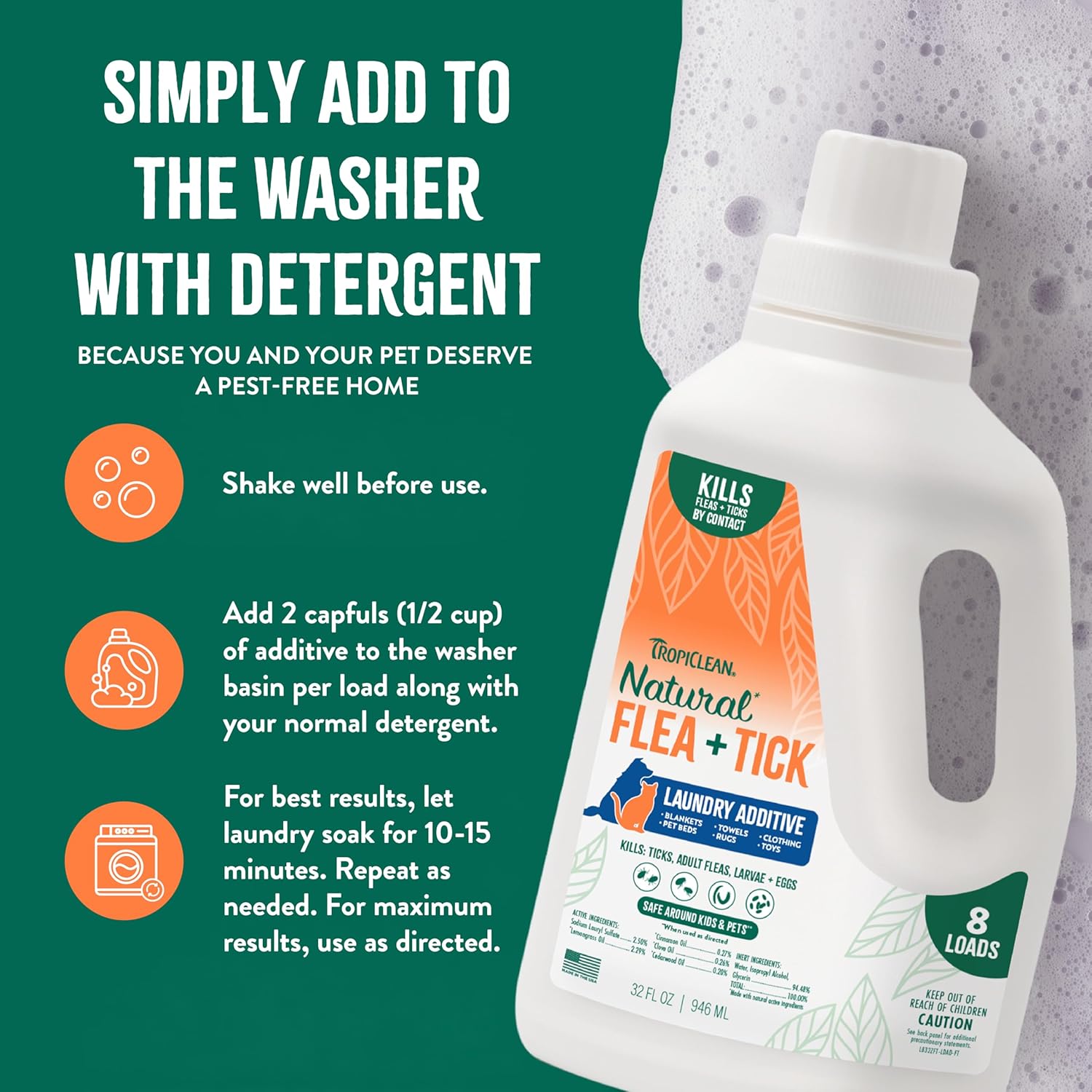 TropiClean Flea and Tick Laundry Additive, Laundry Detergent Booster, Safe for Dogs, Cats, & Home, Powerful Treatment Laundry Addition 32 oz