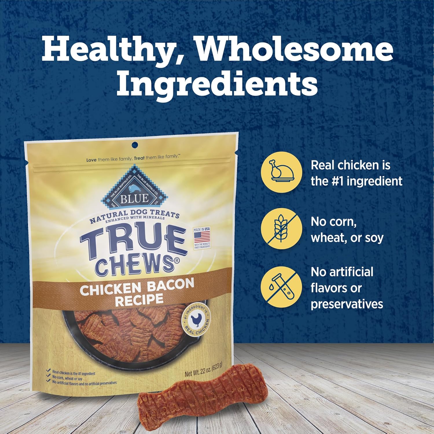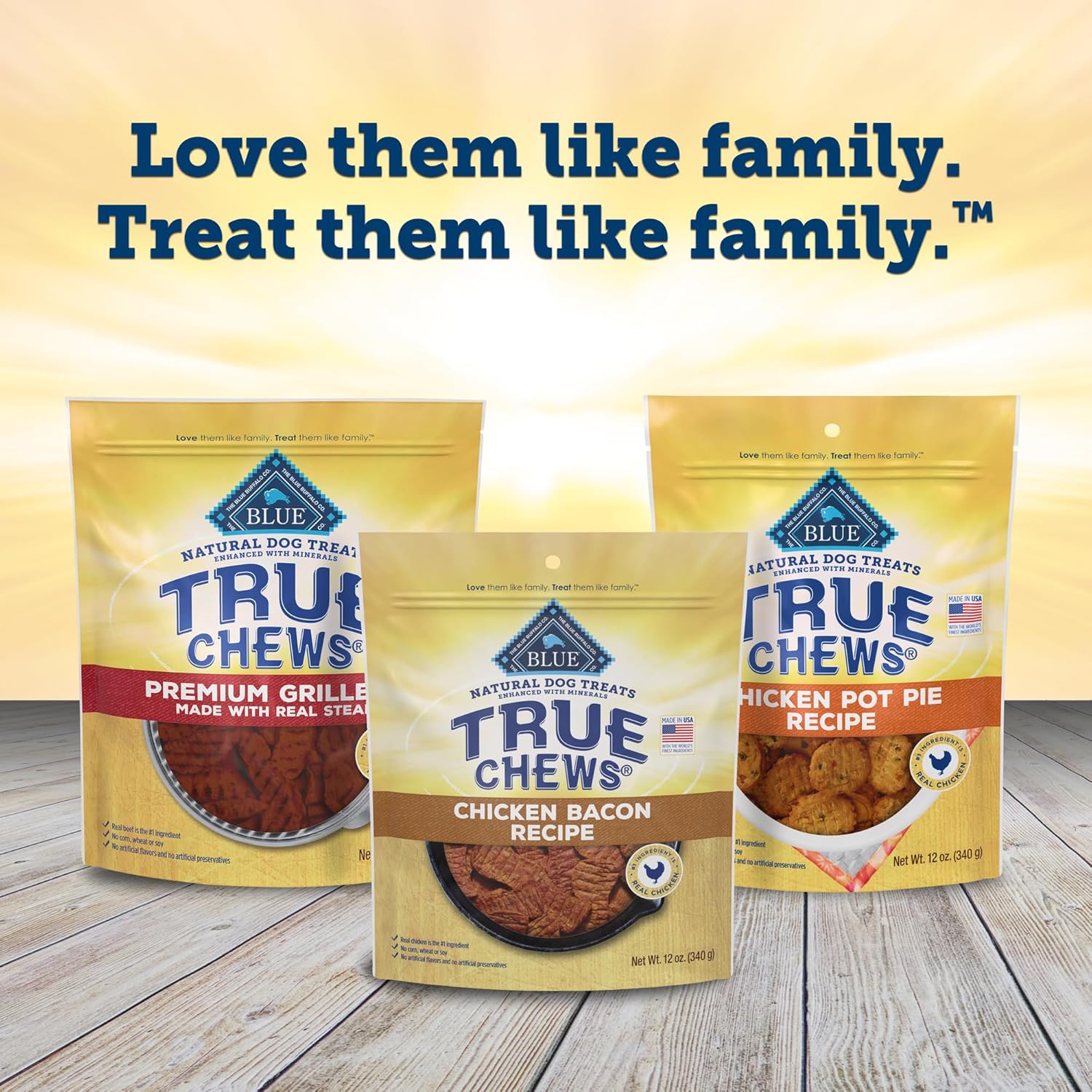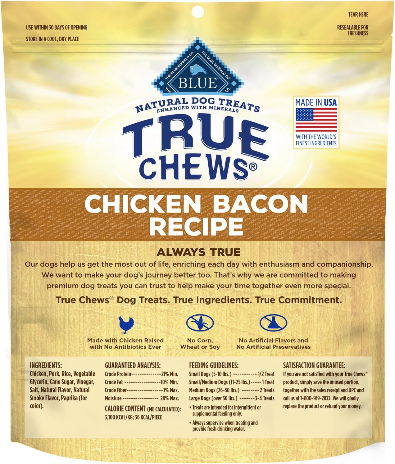 - Contains: One (1) 12-oz bag of BLUE True Chews Natural Chewy Dog Treats; Chicken Bacon Recipe
