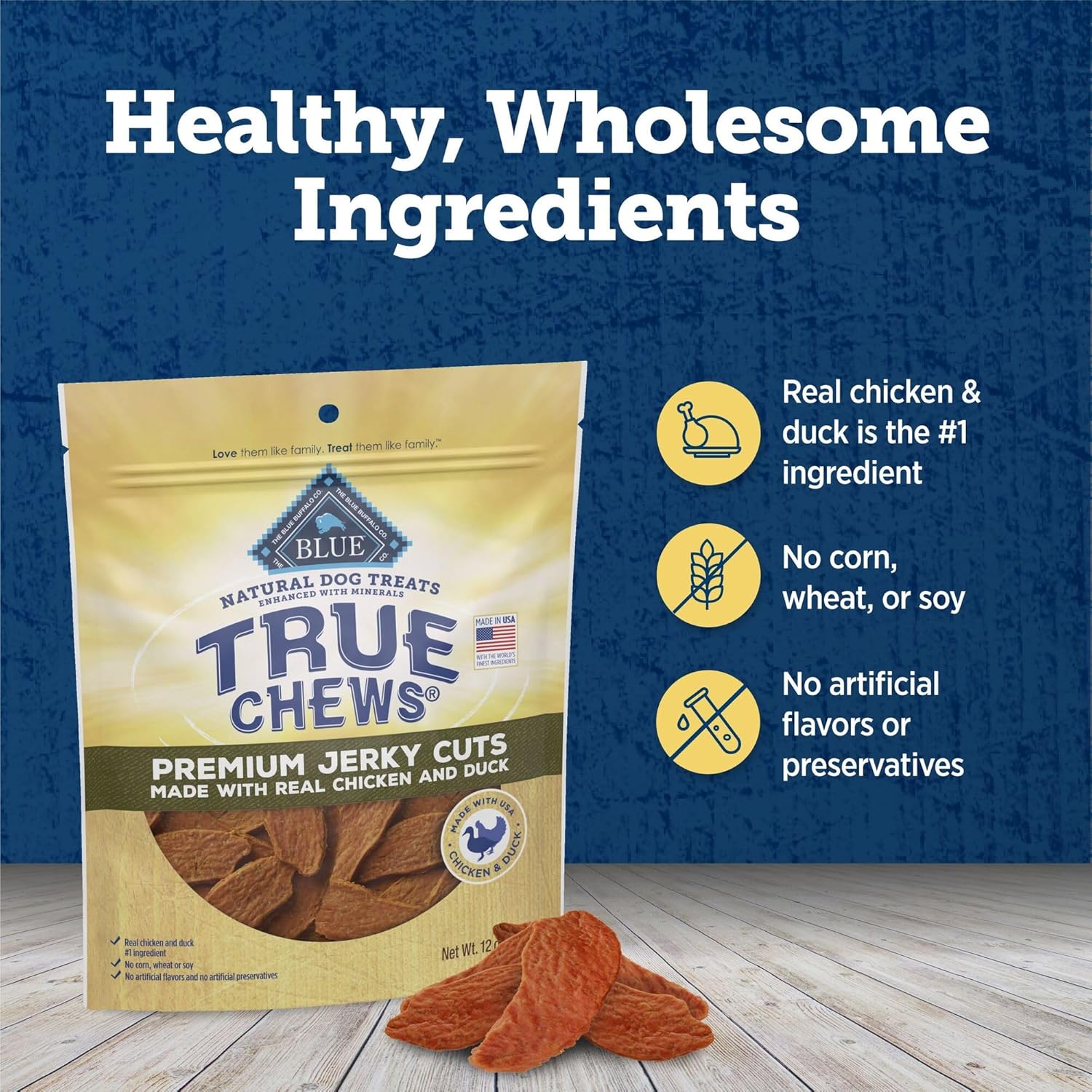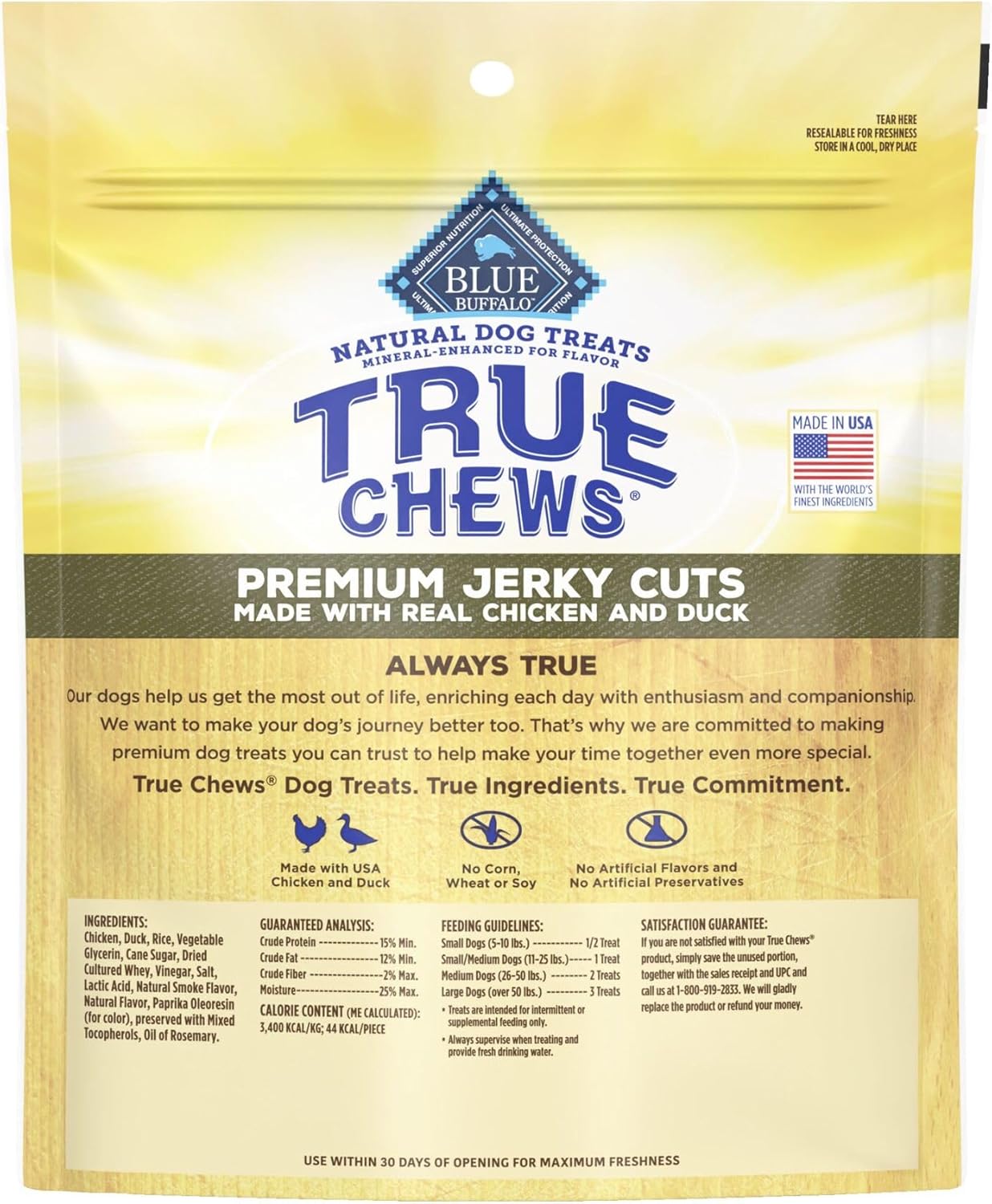 - Contains: One (1) 12-oz bag of BLUE True Chews Natural Jerky Cuts Dog Treats; Duck Recipe