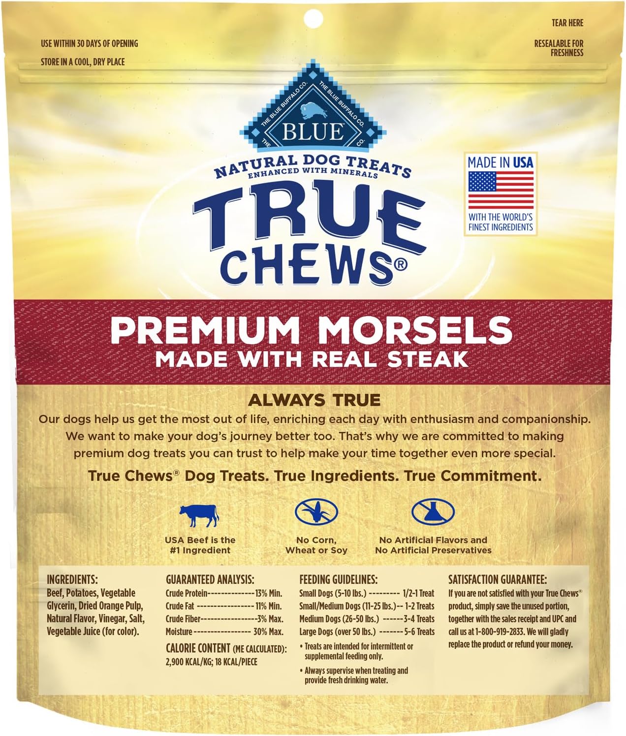 - Contains: One (1) 10-oz bag of BLUE True Chews Natural Premium Morsels Dog Treats, Steak Recipe