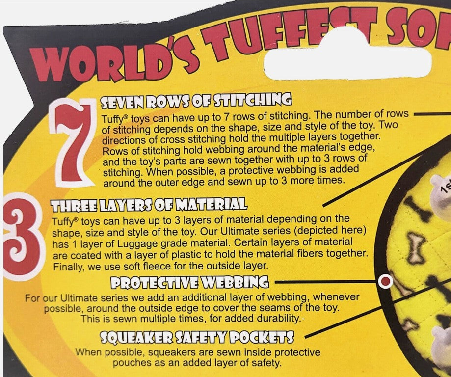 Tuffy toys are designed for interactive play and are not chew toys. No dog toy is indestructible. Always supervise your pet during play and remove the toy if your dog reaches the white stuffed core or begins to ingest any part of it.
