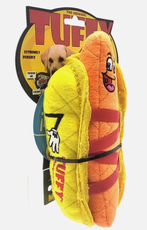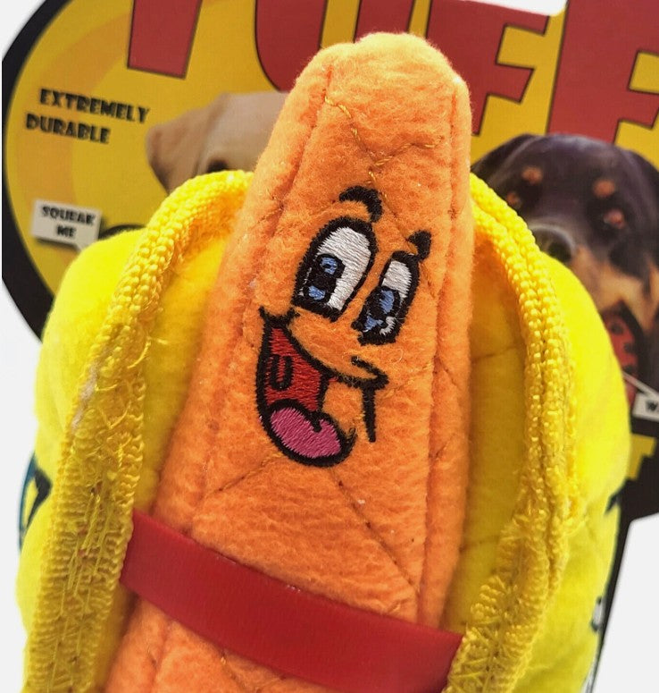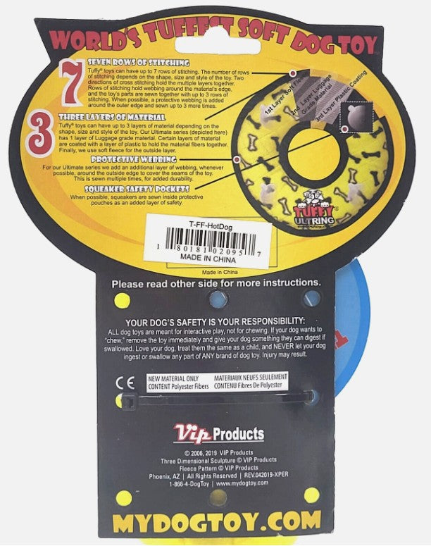 The Tuffy Ultimate Hotdog is built tough for endless fun and interactive play. Designed with up to 4 layers of durable material, this toy combines soft fleece on the outside, industrial-grade luggage fabric on the inside, and a plastic coating for added reinforcement. Seams are secured with multiple rows of stitching, and some areas include protective edging for even greater strength.