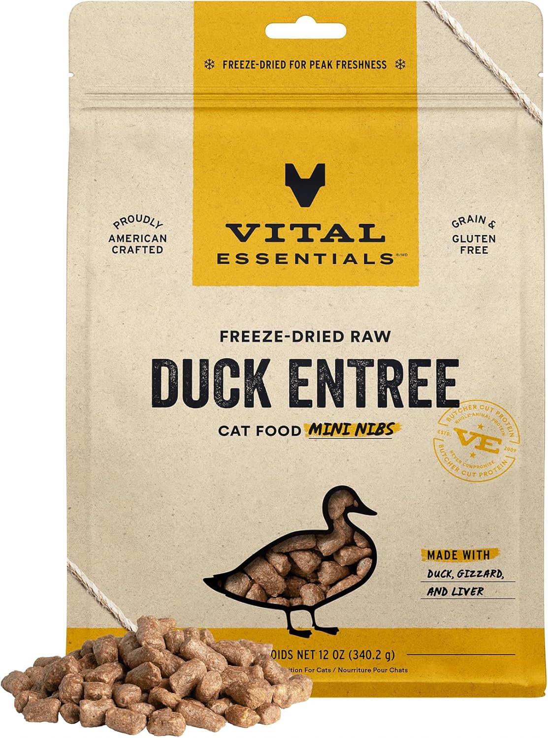 When it comes to feeding your cat a raw diet, superior protein provides superior benefits. Vital Essentials Freeze Dried Raw Duck Cat Food Mini Nibs are packed with premium butcher cut raw protein, responsibly sourced and humanely harvested, to support your cat's overall health and wellness. Whole animal protein from muscle, organs, and bone marrow delivers lean, strong muscles and energy, digestive health, and clean teeth and gums in every bowl, keeping your pet looking and feeling their best. With Vital Essentials, you can feed raw with confidence and ease, and give your cat the health and vitality they deserve.