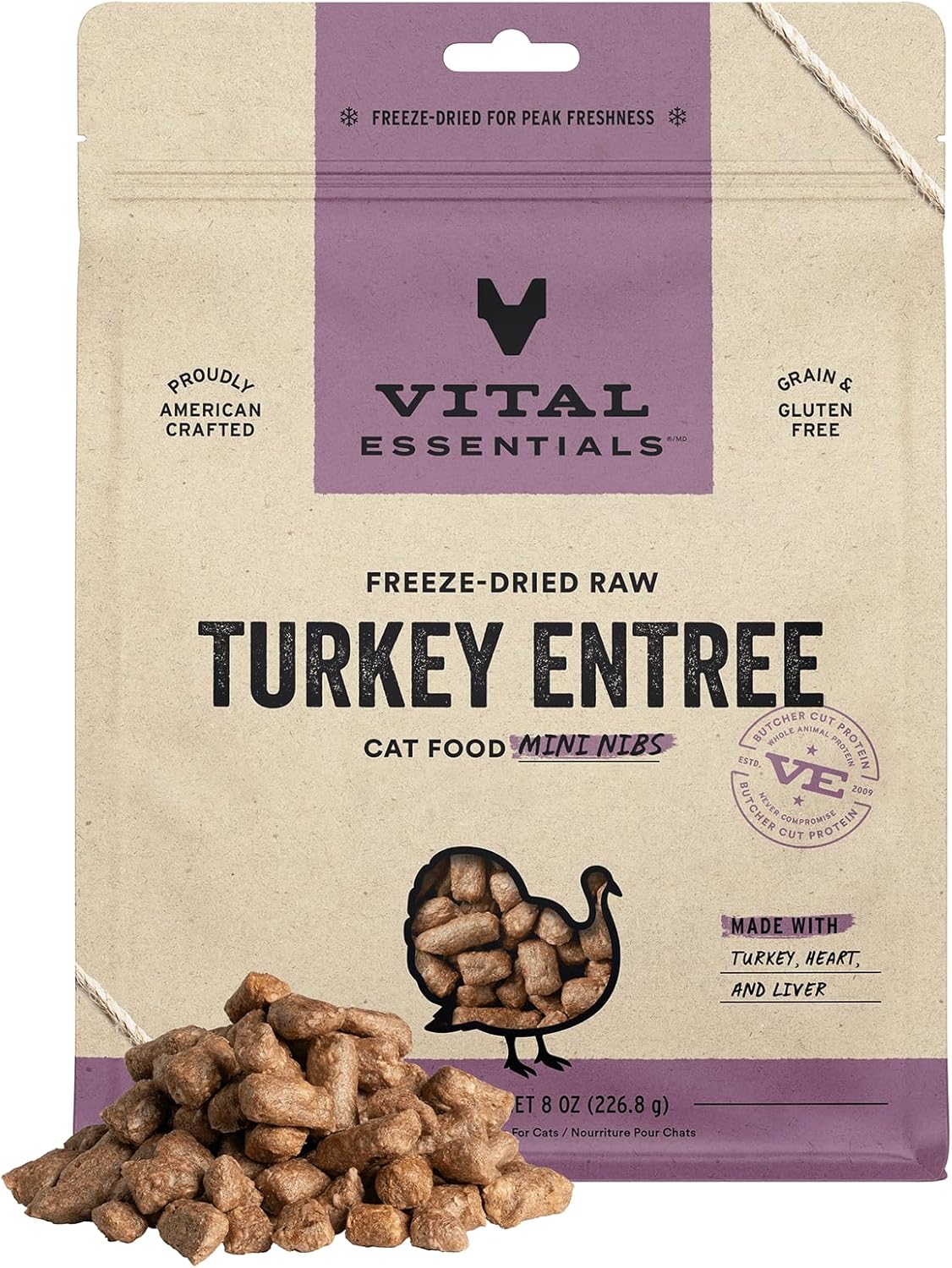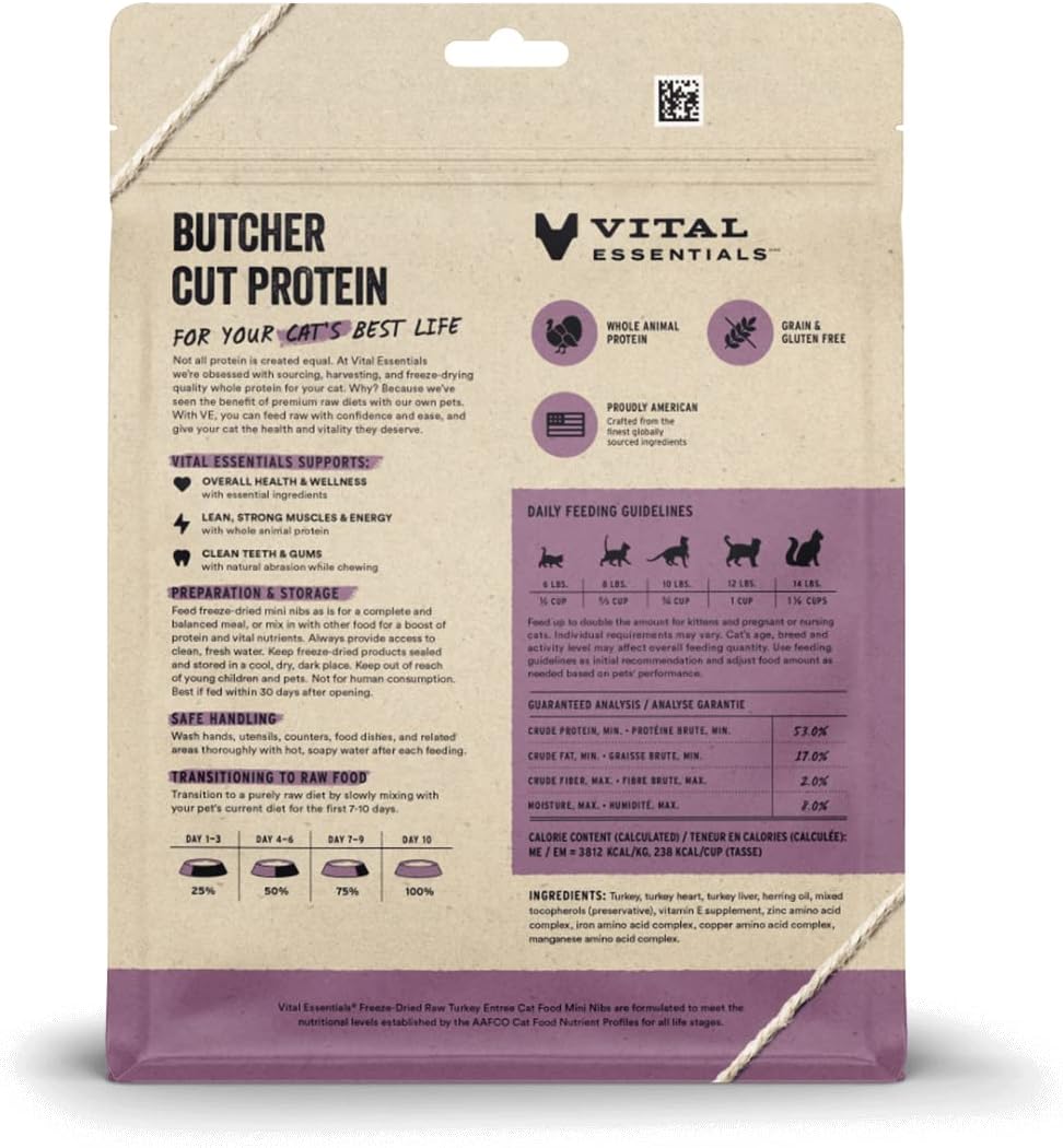 When it comes to feeding your cat a raw diet, superior protein provides superior benefits. Vital Essentials Freeze Dried Raw Turkey Cat Food Mini Nibs are packed with premium butcher cut raw protein, responsibly sourced and humanely harvested, to support your cat's overall health and wellness. Whole animal protein from muscle, organs, and bone marrow delivers lean, strong muscles and energy, digestive health, and clean teeth and gums in every bowl, keeping your pet looking and feeling their best. With Vital Essentials, you can feed raw with confidence and ease, and give your cat the health and vitality they deserve. CALORIE CONTENT: ME = 3812 kcal/kg | ME = 238 kcal/cup. GUARANTEED ANALYSIS: Crude Fiber, max: 2% | Crude Fat, min: 17% | Crude Protein, min: 53% | Moisture, max: 8%. PREPARATION & STORAGE: Feed freeze-dried mini nibs as is for a complete and balanced meal or mix in with other food for a boost of protein and vital nutrients. Always provide access to clean, fresh water. Keep freeze-dried products sealed and stored in a cool, dry dark place. Keep out of reach of young children and pets. Not for human consumption. Best if fed within 30 days after opening.