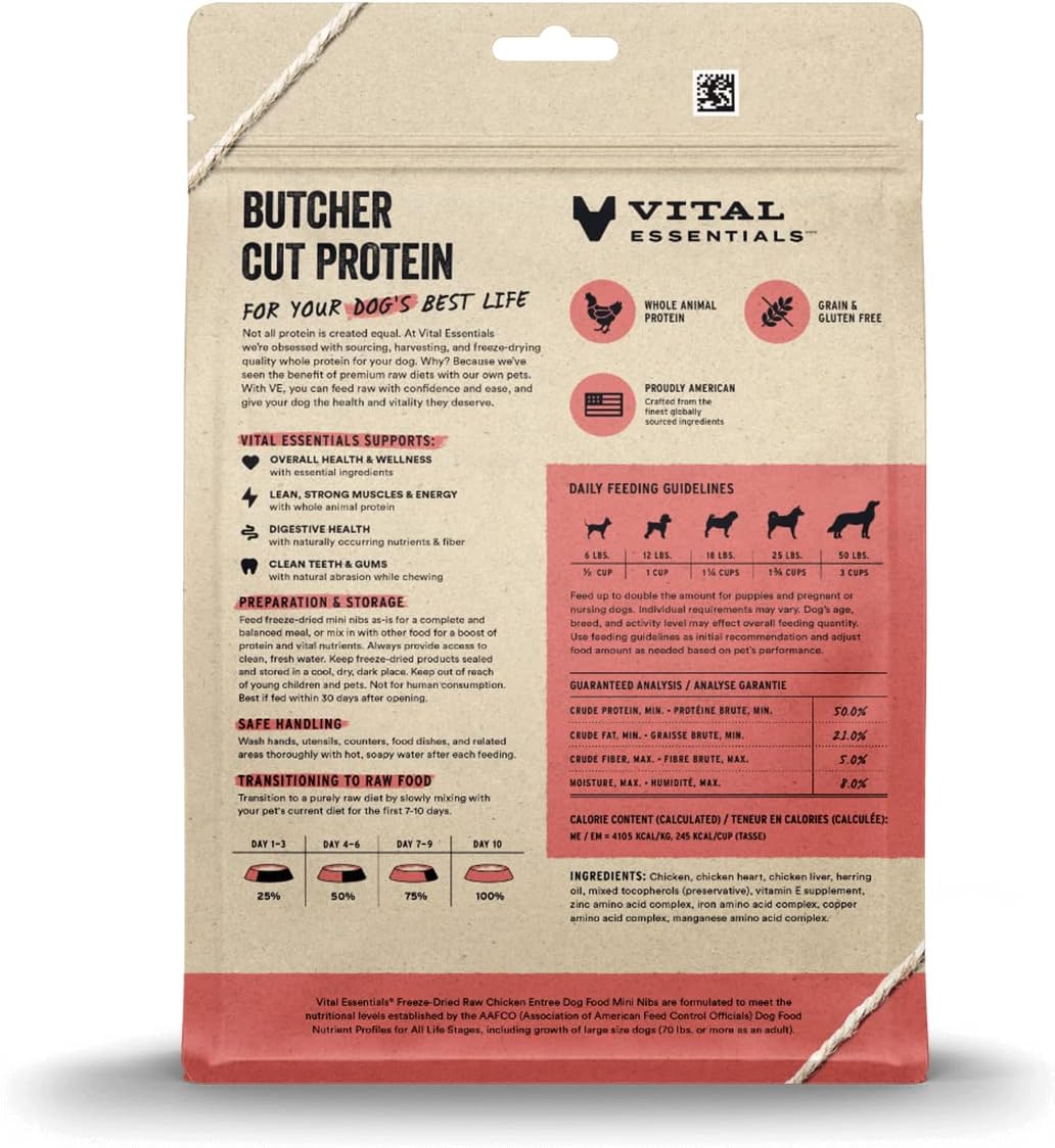 When it comes to feeding your dog a raw diet, superior protein provides superior benefits. Vital Essentials Freeze Dried Raw Beef Entree Dog Food Mini Nibs are packed with premium butcher cut raw protein, responsibly sourced and humanely harvested, to support your dog's overall health and wellness. Whole animal protein from muscle, organs, and bone marrow delivers lean, strong muscles and energy, digestive health, and clean teeth and gums in every bowl, keeping your pet looking and feeling their best. With Vital Essentials, you can feed raw with confidence and ease, and give your dog the health and vitality they deserve. CALORIE CONTENT: ME = 4105 kcal/kg | ME = 245 kcal/cup. GUARANTEED ANALYSIS: Crude Fiber, max: 5% | Crude Fat, min: 21% | Crude Protein, min: 50% | Moisture, max: 8%. PREPARATION & STORAGE: Feed freeze-dried mini nibs as is for a complete and balanced meal or mix in with other food for a boost of protein and vital nutrients. Always provide access to clean, fresh water. Keep freeze-dried products sealed and stored in a cool, dry dark place. Keep out of reach of young children and pets. Not for human consumption. Best if fed within 30 days after opening.