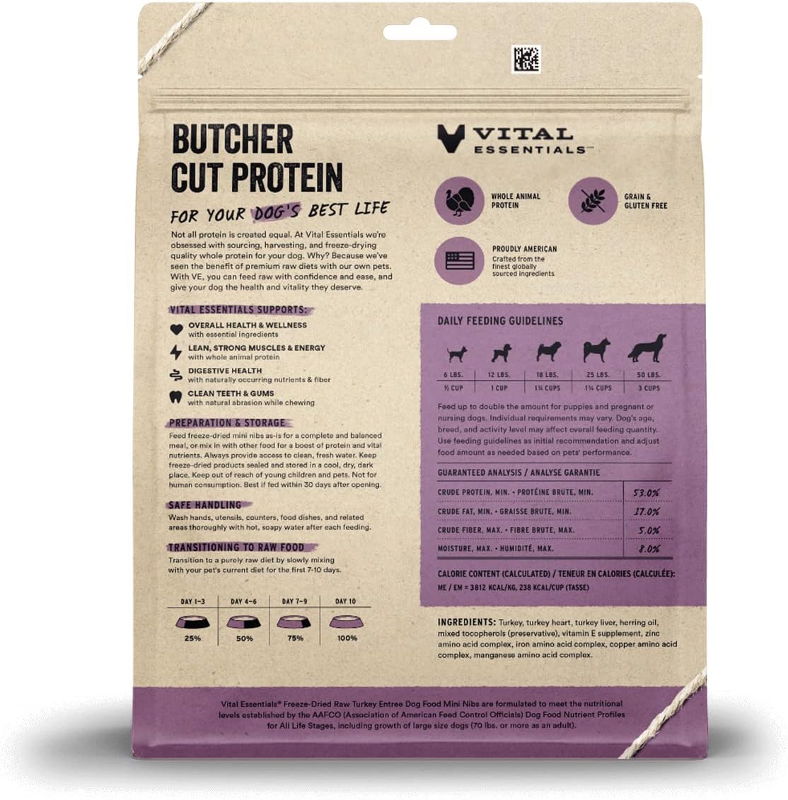 hen it comes to feeding your dog a raw diet, superior protein provides superior benefits. Vital Essentials Freeze Dried Raw Turkey Dog Food Mini Nibs are packed with premium butcher cut raw protein, responsibly sourced and humanely harvested, to support your dog's overall health and wellness. Whole animal protein from muscle, organs, and bone marrow delivers lean, strong muscles and energy, digestive health, and clean teeth and gums in every bowl, keeping your pet looking and feeling their best. With Vital Essentials, you can feed raw with confidence and ease, and give your dog the health and vitality they deserve.