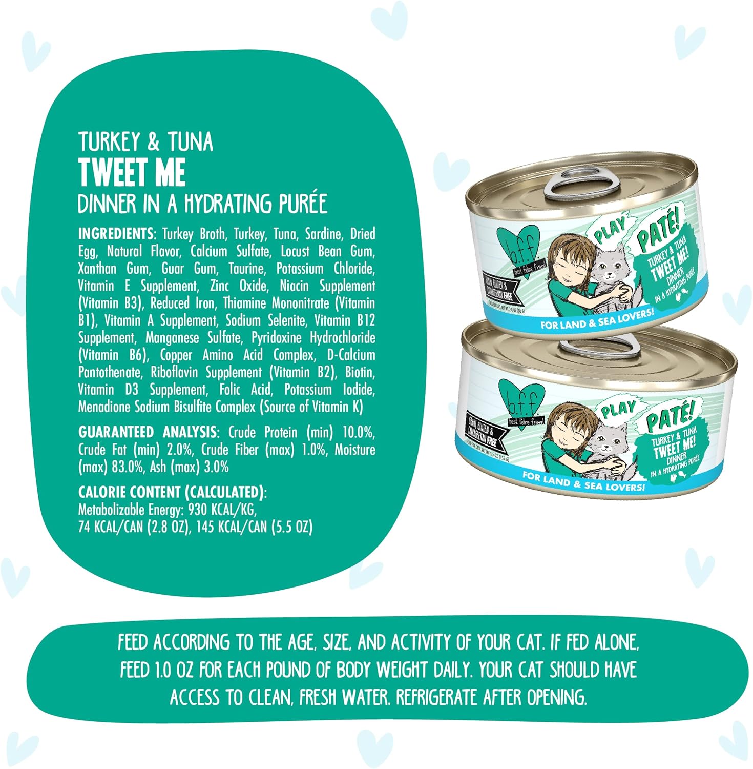 Weruva B.F.F. Play - Best Feline Friend Paté Lovers, Aw Yeah!, Turkey & Tuna Tweet Me! with Turkey & Tuna 2.8-oz(Pack of 12)