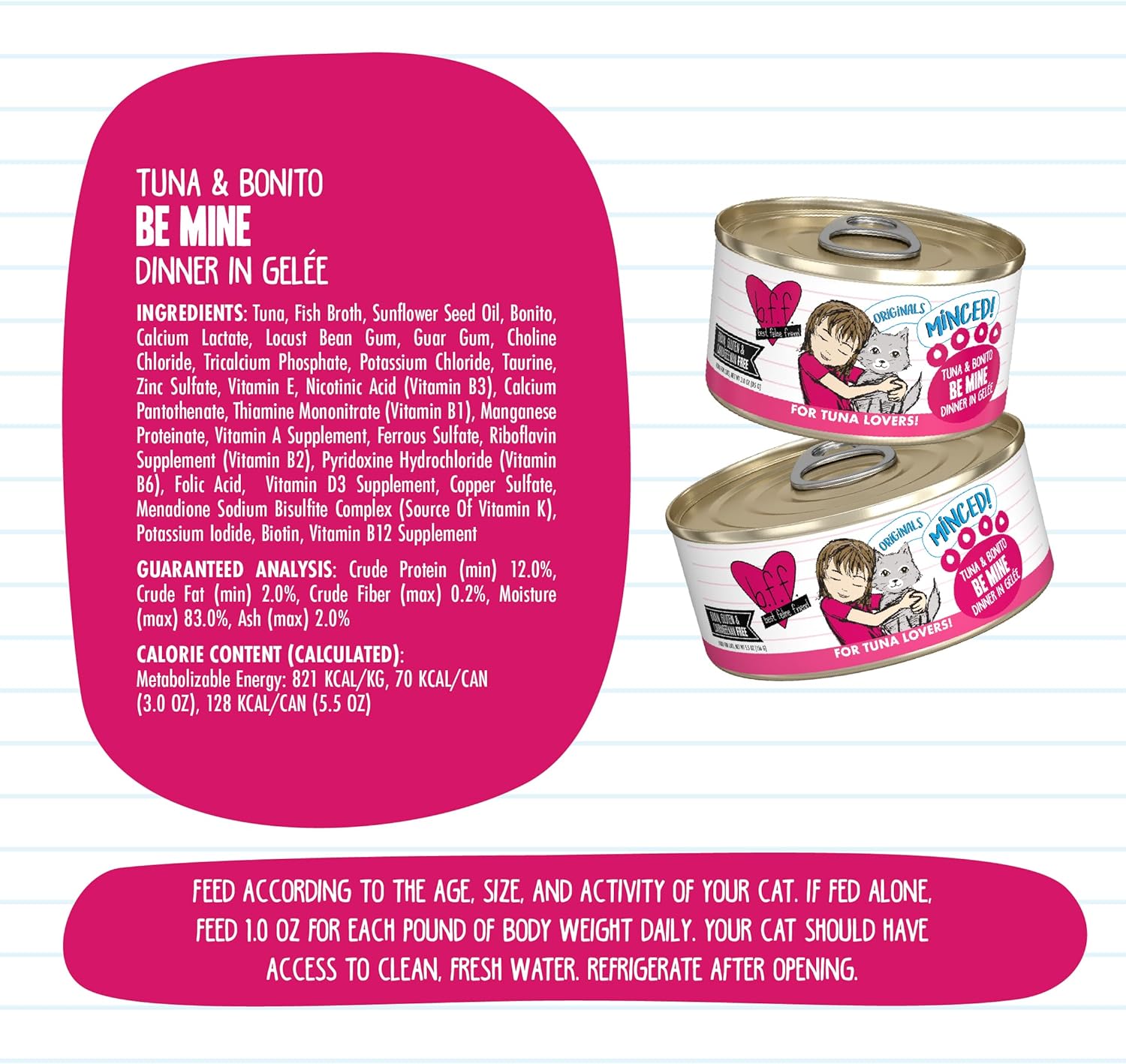 Grab the best food for your Best Feline Friend with the BFF Tuna and Bonito Be Mine Canned Cat Food. The BFF canned food is always packed full of high-quality proteins and limited carbohydrates processed in a human grade facility. These wholesome canned cat foods are all made with delicious red meat proteins and low fat to keep your pet fit and screaming "BE MINE!" once they get a bite. The BFF Tuna and Bonito Be Mine Canned Cat Food are primarily made of wild-caught bonito tuna which is both dolphin and turtle-safe! BFF Canned foods are also Grain Free and BPA free for a happy and healthy kitty.