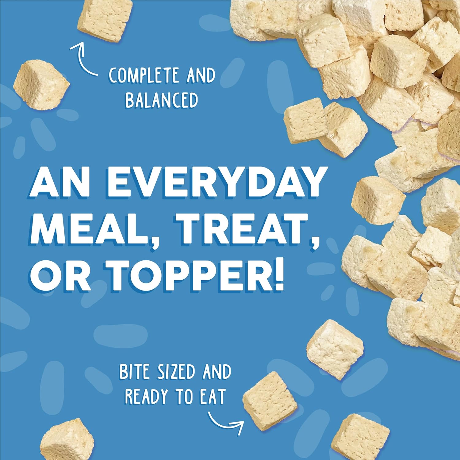This fully cooked freeze-dried recipe is made with high-quality chicken breast, gently prepared into bite-sized cubes that are ready to serve. It can be fed dry, rehydrated with water for added moisture, or mixed with Weruva wet food for an even more enticing meal. Convenient and worry-free, this food offers the protein and nutrition your dog needs with none of the fillers they don’t.