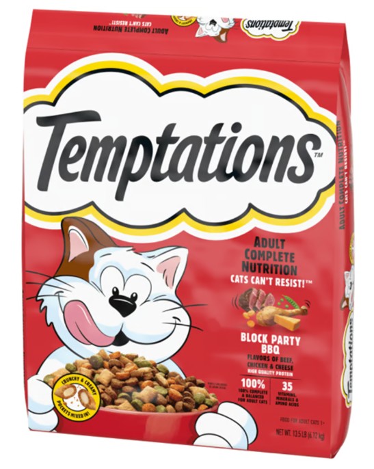 TEMPTATIONS Block Party BBQ Flavor Dry Cat Food brings the irresistible taste of TEMPTATIONS treats into your cat’s daily meals. This delicious dry kibble combines crunchy bite-sized pieces with special pockets that have a crunchy exterior and soft filling, keeping your cat excited at every bite. Made with beef, chicken, and cheese flavors, this savory recipe is designed to satisfy even picky eaters while providing balanced nutrition for adult cats.