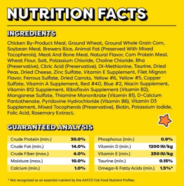 This adult dry cat food is 100% complete and balanced, containing 35 essential vitamins, minerals, and amino acids. It is made with high-quality protein to support strong and healthy muscles, while Omega-6 fatty acids help maintain shiny fur. Added calcium and vitamin D support healthy teeth and bones, and vitamin E helps promote a strong immune system. With both taste and nutrition, this recipe makes mealtime something your feline friend will look forward to.