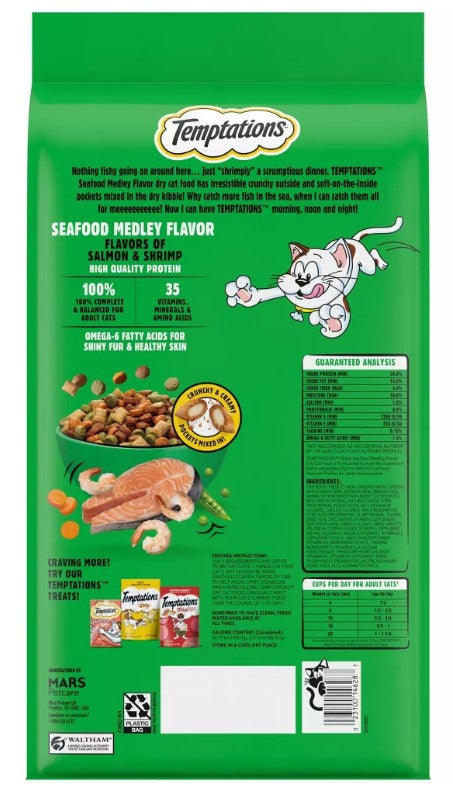 Cats can’t resist the flavor of TEMPTATIONS Seafood Medley Dry Cat Food! Now you can bring the excitement of TEMPTATIONS treat time straight to mealtime. This irresistible recipe combines the delicious taste of salmon and shrimp with crunchy kibble and TEMPTATIONS’ signature crunchy-on-the-outside, soft-on-the-inside pockets.