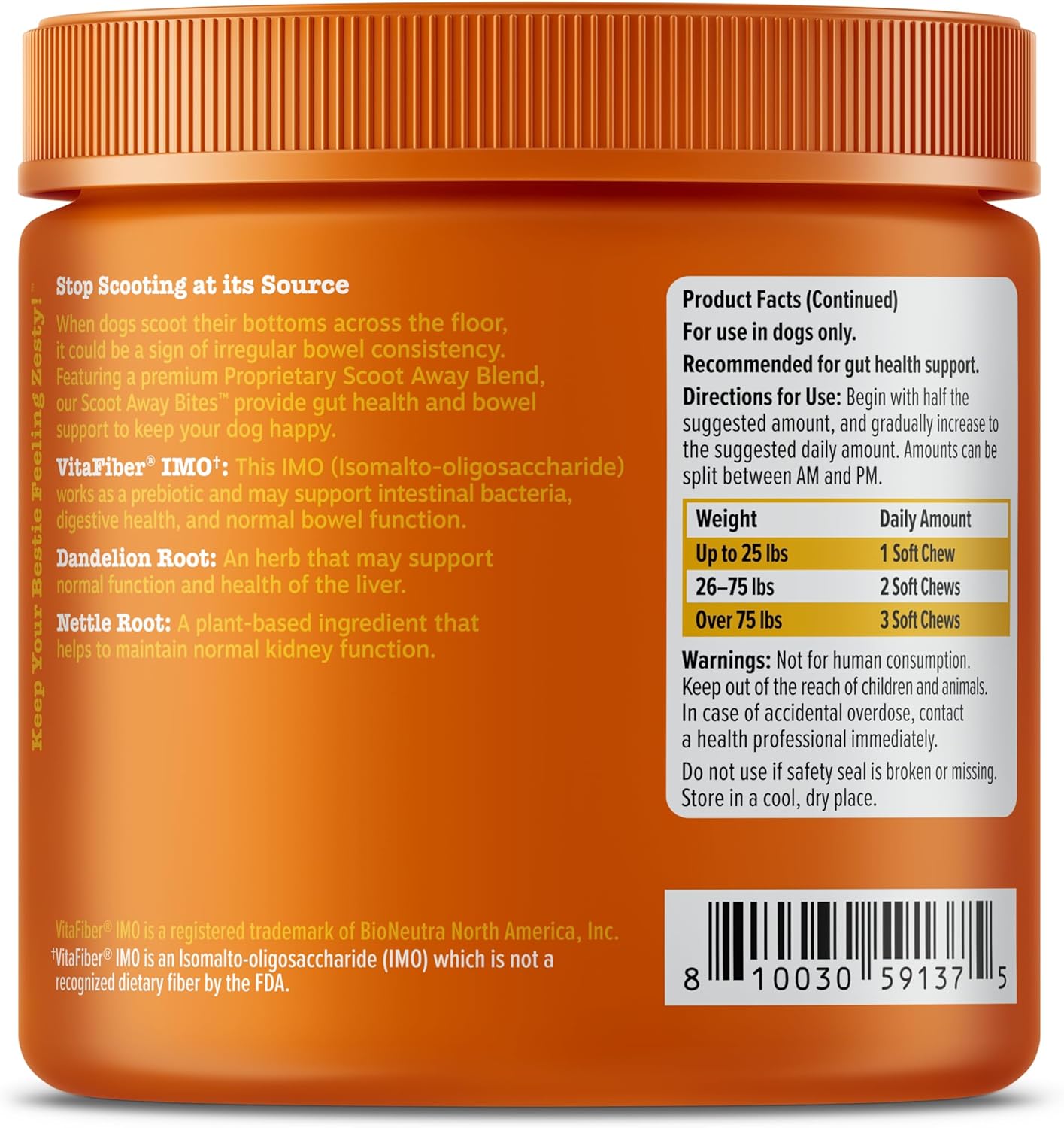 - Keep Your Canine Scoot Free – Zesty Paws Scoot Away Bites are soft chews that feature VitaFiber * and Dandelion Root to support gut health and bowel function for dogs