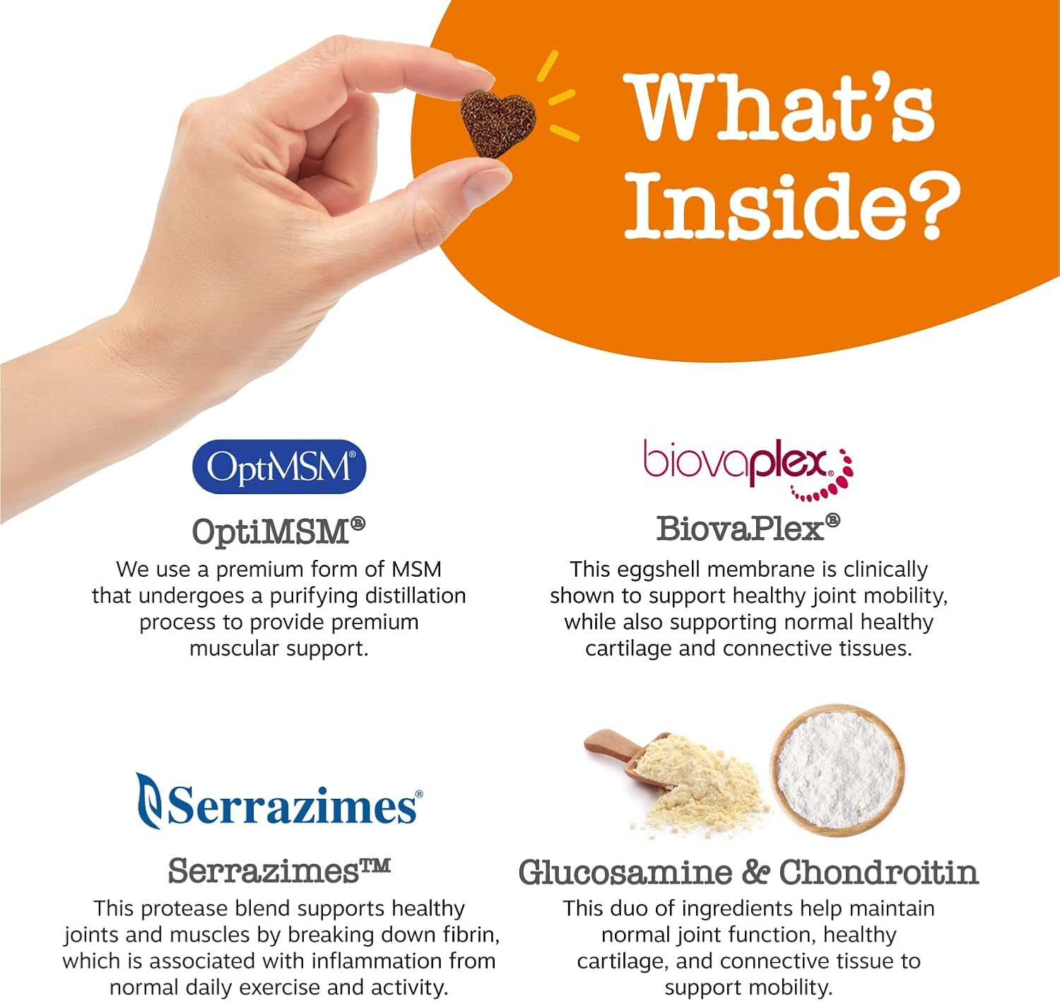 - PLUS BIOVAPLEX: These soft chews include this advanced eggshell membrane, which is clinically shown to support healthy joint mobility, along with normal healthy cartilage and connective tissues.