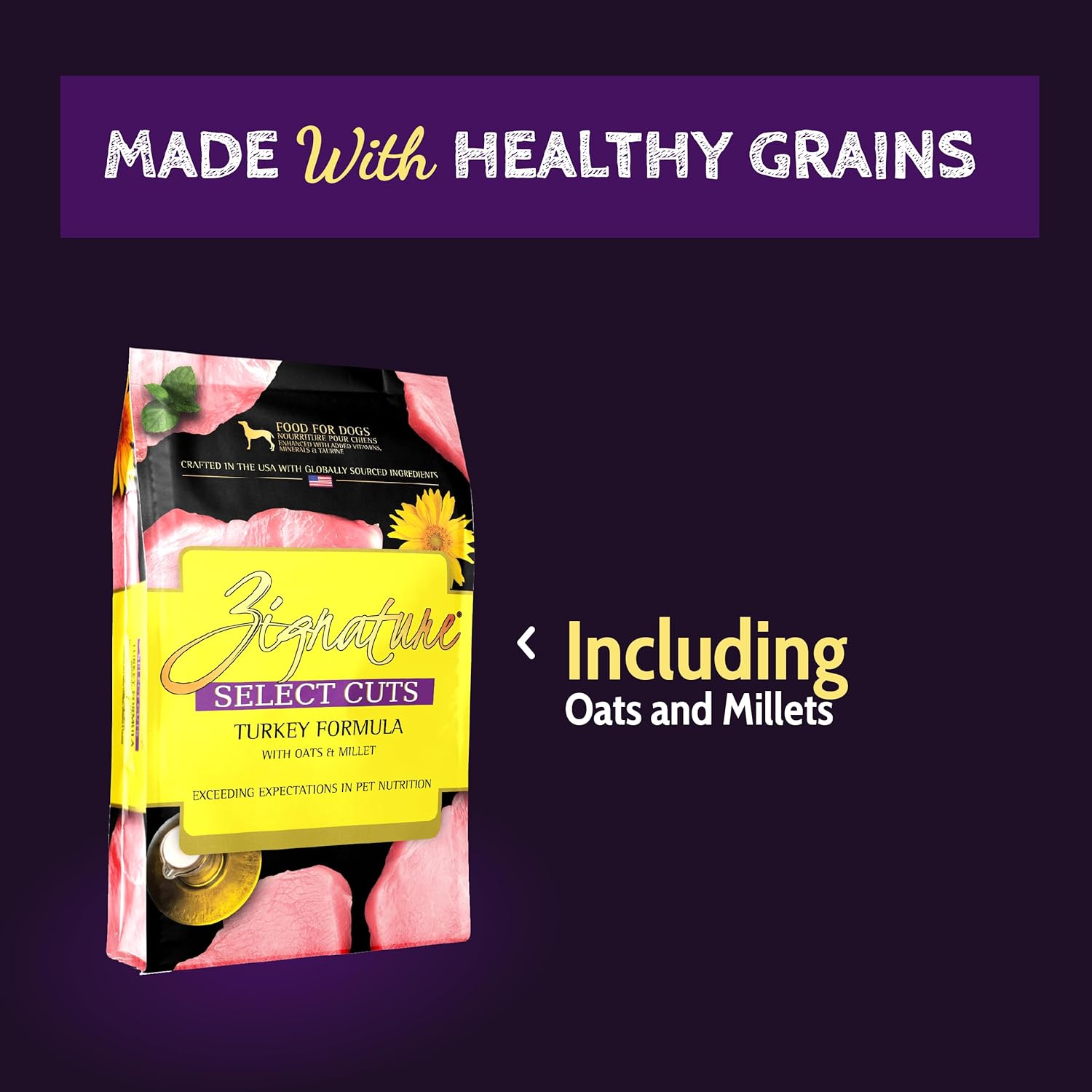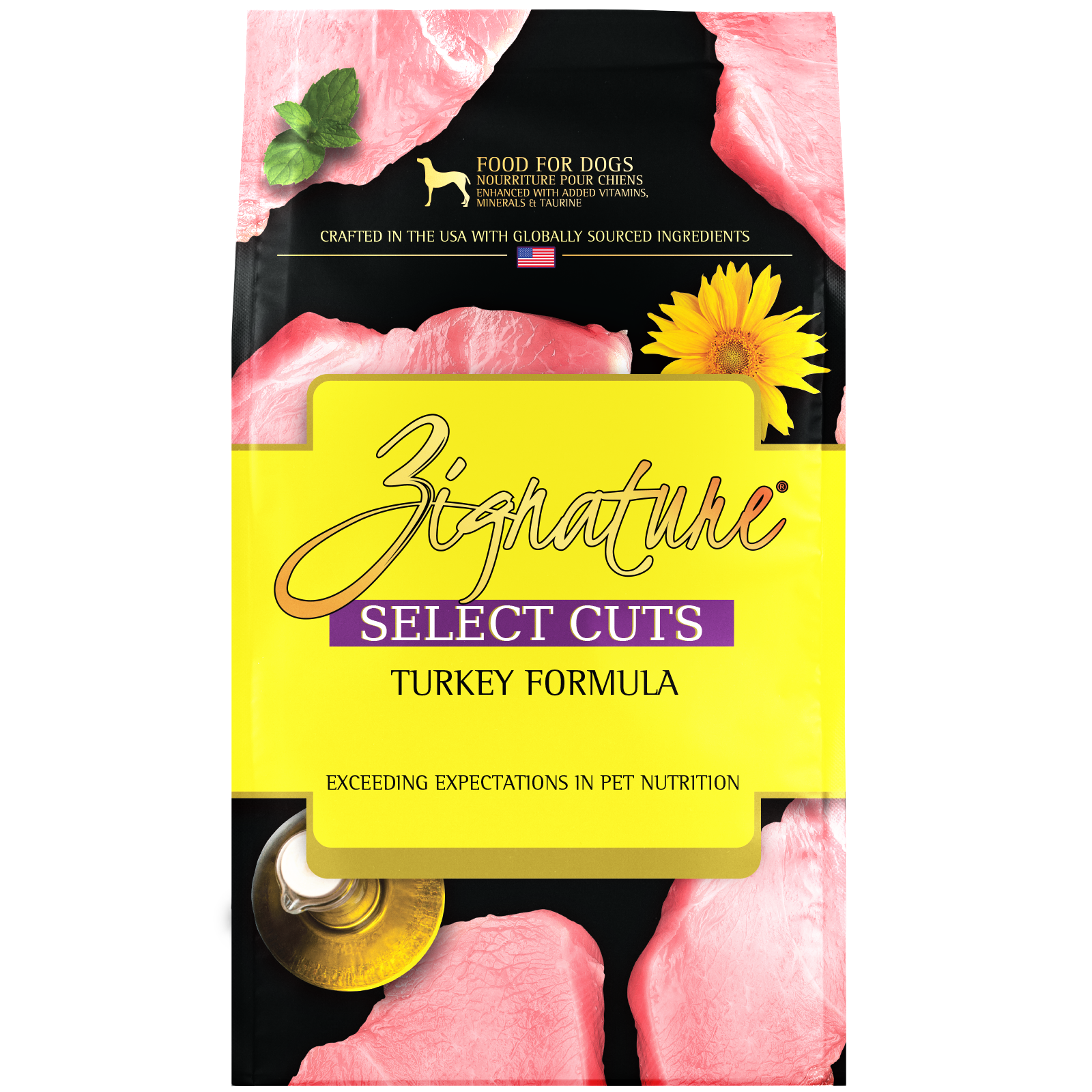 Zignature's Select Cuts line was cultivated using the same limited-ingredient philosophy as the original line but features nutrient-dense grains like oats and millet. Zignature Select Cuts Turkey Formula features high-quality turkey as the main ingredient and is fortified with vitamins and minerals to ensure your dog gets the necessary nutrients. This Select Cuts line may be an excellent option for dogs who don't struggle with grain sensitivities!