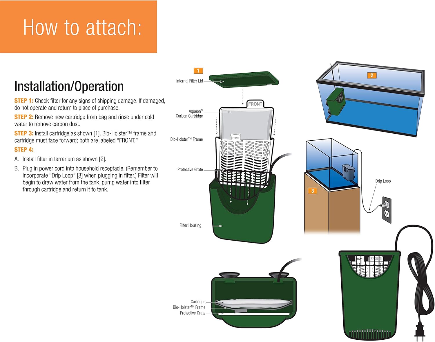 Medium carbon cartridge included Protective grate prevents animal from entering the filter Patented power filtration Easy installation...
