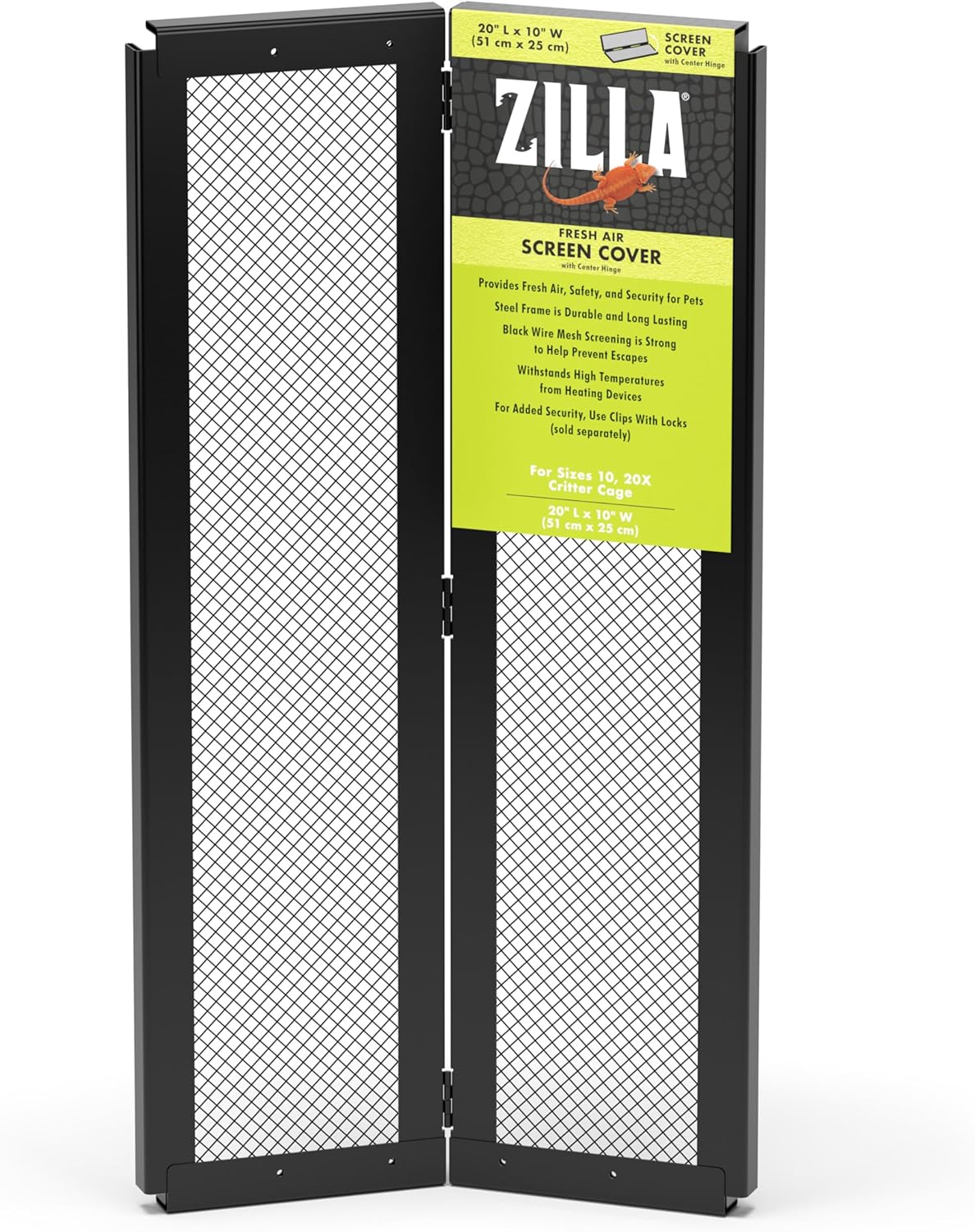 Center hinge for habitats that require frequent access Steel holds up to high temperatures Metal mesh provides...